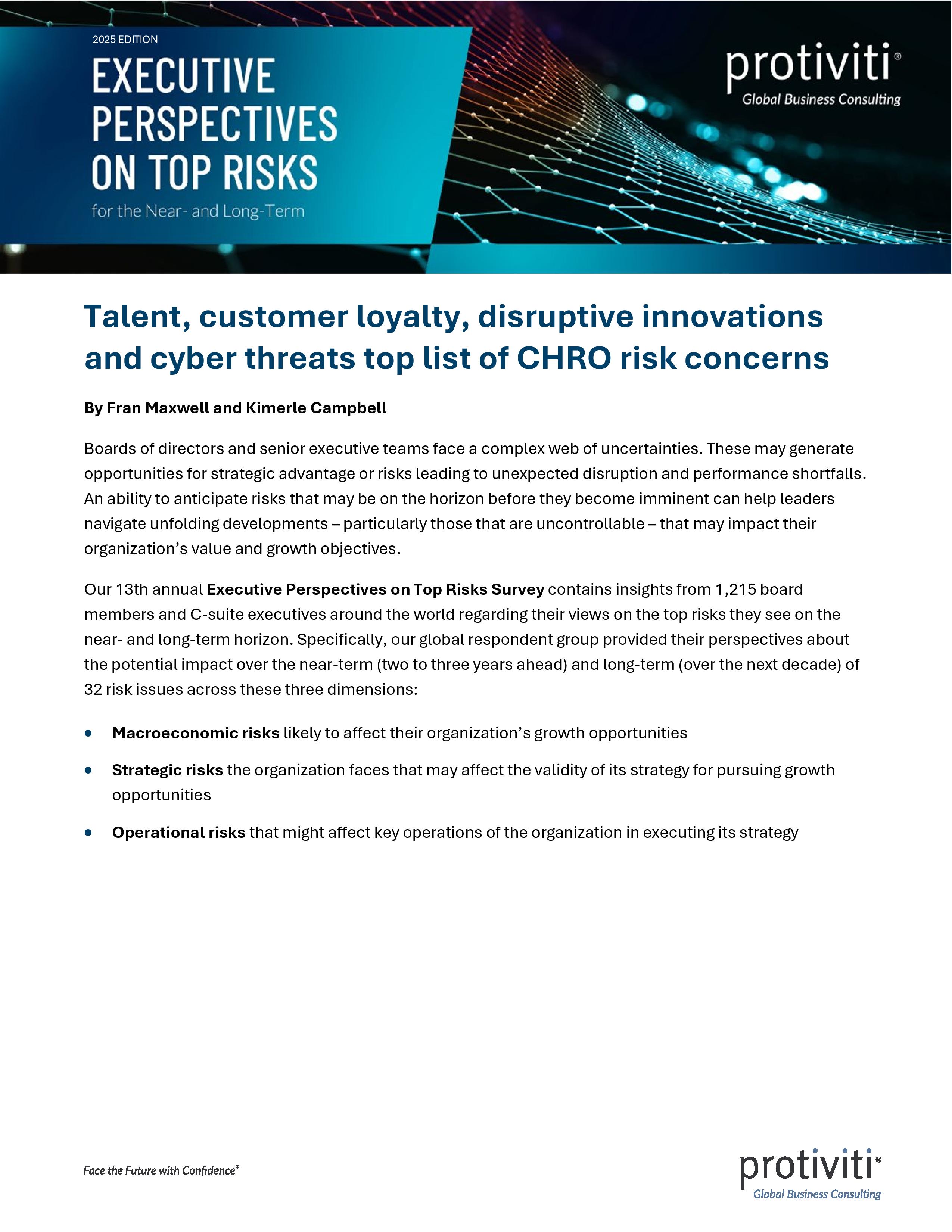 Leverage the insights from this report to enhance your organization's talent management strategies, address emerging risks, and foster a culture of agility and innovation in response to the evolving workforce landscape. Drawing insights from Protiviti's 13th annual Executive Perspectives on Top Risks Survey, which collected responses from over 1,200 executives globally, the report examines near-term (two to three years) and long-term (up to 2035) challenges across macroeconomic, strategic and operational dimensions.