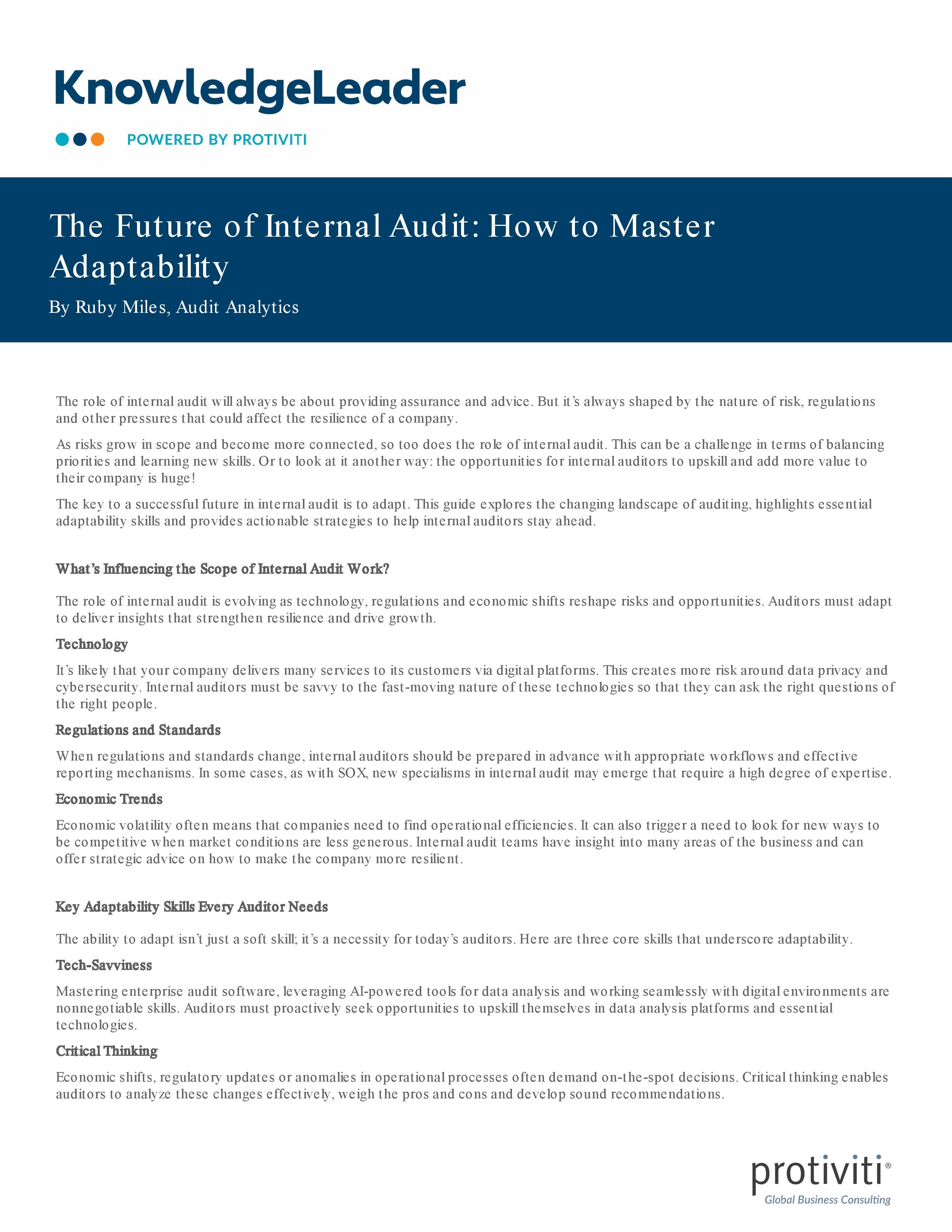 In this article, Audit Analytics explores the changing landscape of auditing, highlights essential adaptability skills and provides actionable strategies to help internal auditors stay ahead. As organizations face increasing risks, including cybersecurity threats and data privacy issues, the role of internal audit is more vital than ever in providing assurance and strategic insights. Auditors are now required to possess a diverse set of skills, including technological proficiency, critical thinking and effective communication, to navigate complex challenges and present actionable findings to a variety of stakeholders. The article emphasizes that adaptability is not merely a skill but a mindset that auditors must cultivate continuously.