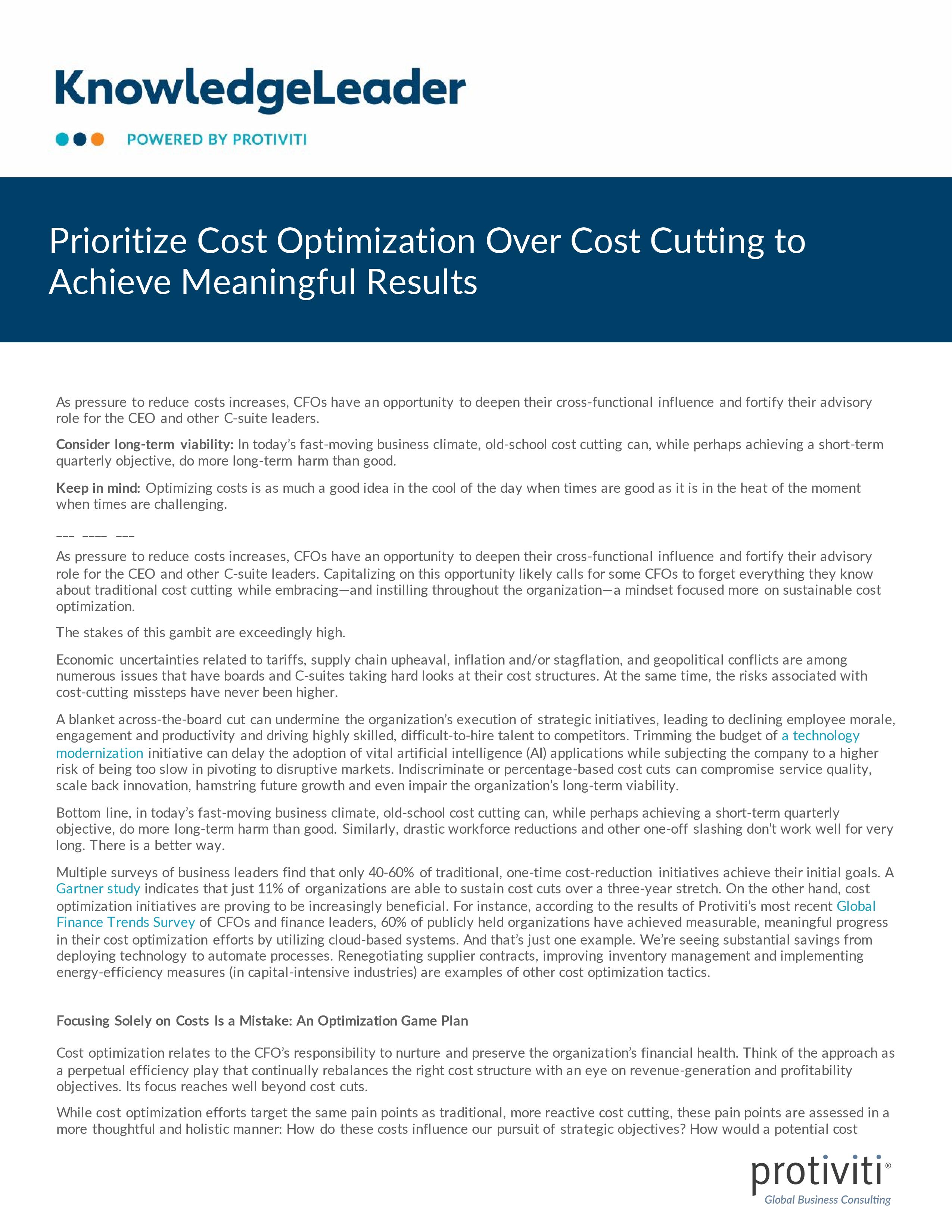 This article underscores the superiority of cost optimization strategies over traditional cost-cutting in today's volatile business landscape. While immediate cost reductions might achieve short-term goals, they often inflict long-term damage on an organization’s morale, innovation capacity and strategic execution. CFOs are advised to shift from old-school cost-cutting to a sustainable cost optimization approach, which not only aligns costs with business value but also supports strategic objectives, enhancing the company's agility and resilience. The narrative warns against the hazards of indiscriminate cost reductions, such as diminished service quality and hindered growth, advocating instead for a methodical approach that uses advanced analytics and AI to pinpoint effective cost-saving measures.