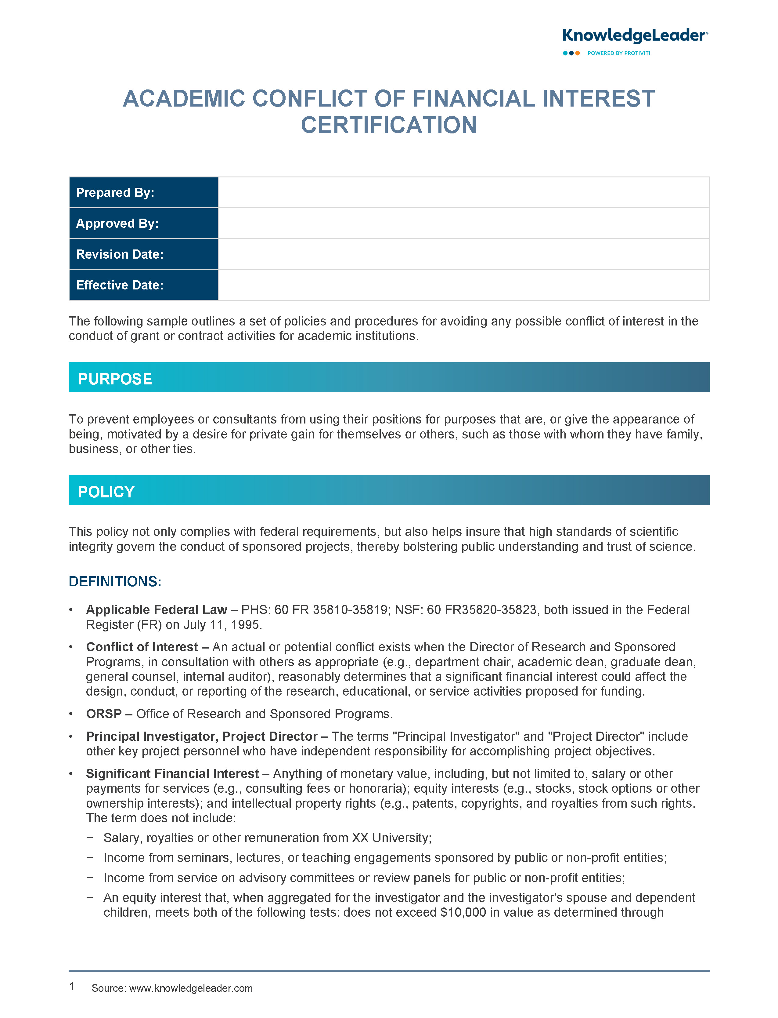 This sample policy is designed to help organizations avoid possible conflicts of interest in the conduct of grant or contract activities for academic institutions.