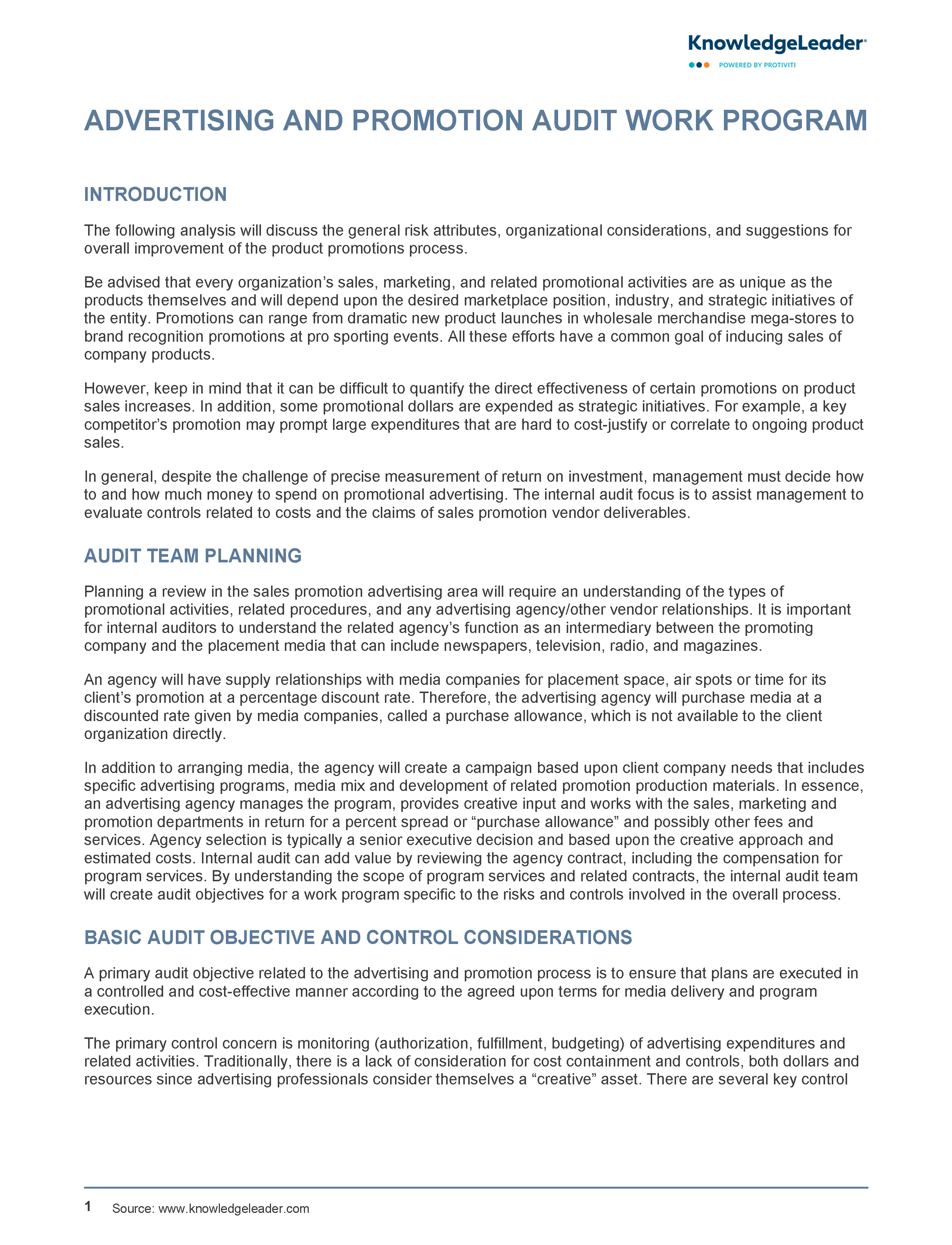 In this work program sample, we provide general best-practice steps for the advertising and promotion audit process.