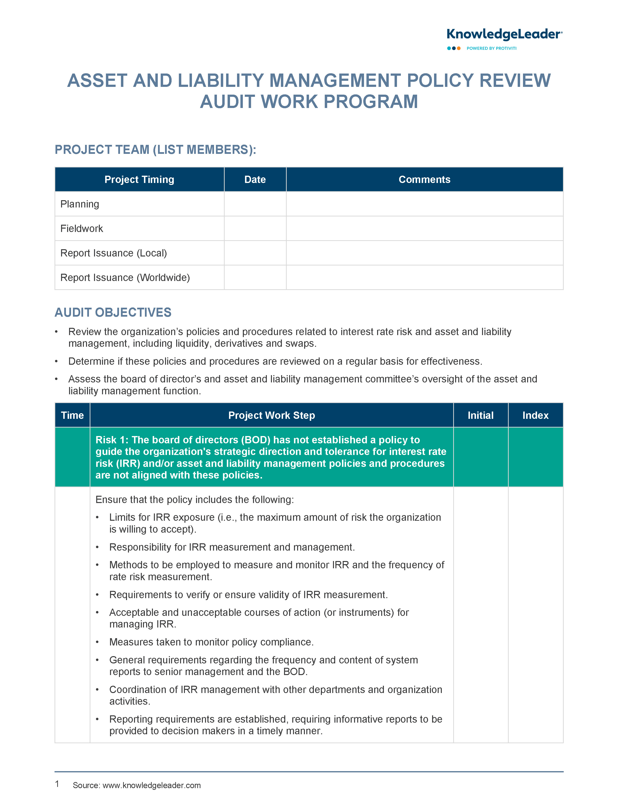 Evaluate your organization's asset and liability management policies, procedures and risk oversight with the best-practice steps in this work program. This includes reviewing the organization's approach to interest rate risk, liquidity management, derivatives and swaps. The document provides a structured work program with specific steps to assess the board of directors and asset and liability management committee oversight, the adequacy of policies and procedures, their alignment with strategic direction, and their regular review for effectiveness.