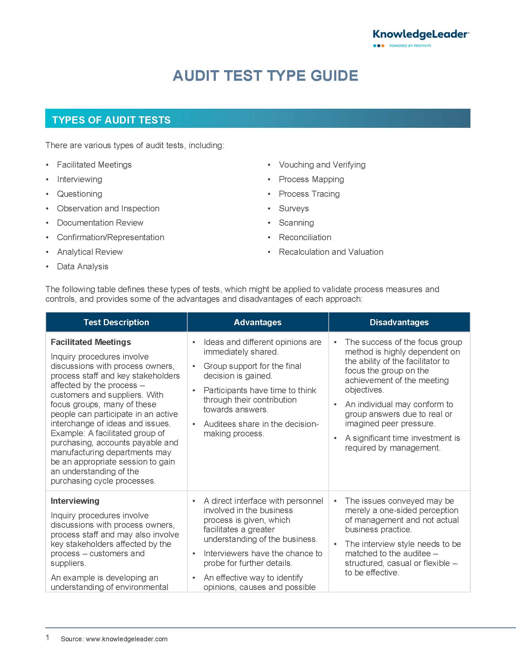 Certain advantages of specific audit test types include: Ideas and different opinions are immediately shared; group support for the final decision is gained; participants have time to think through their contribution toward answers; a direct interface with personnel involved in the business process is given, which facilitates a greater understanding of the business; interviewers have the chance to probe for further details; and an effective way to identify opinions, causes and possible solutions to problems is identified.