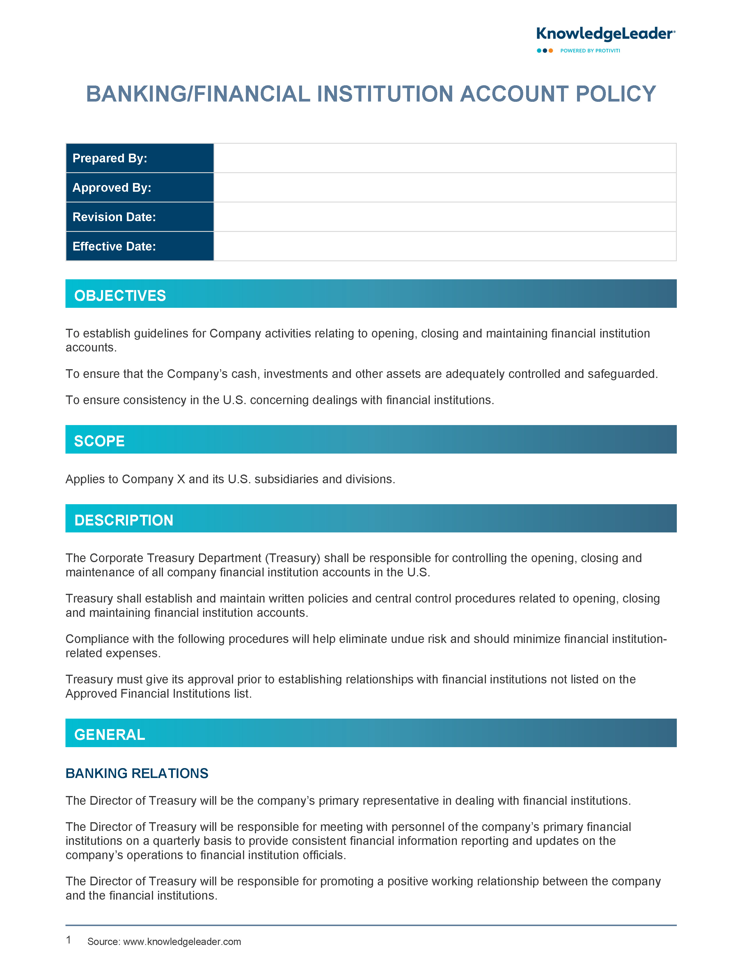 Our Banking/Financial Institution Account Policy provides a framework for managing corporate banking relationships and financial accounts. It includes three samples that delineate specific policies, objectives and operational guidelines.