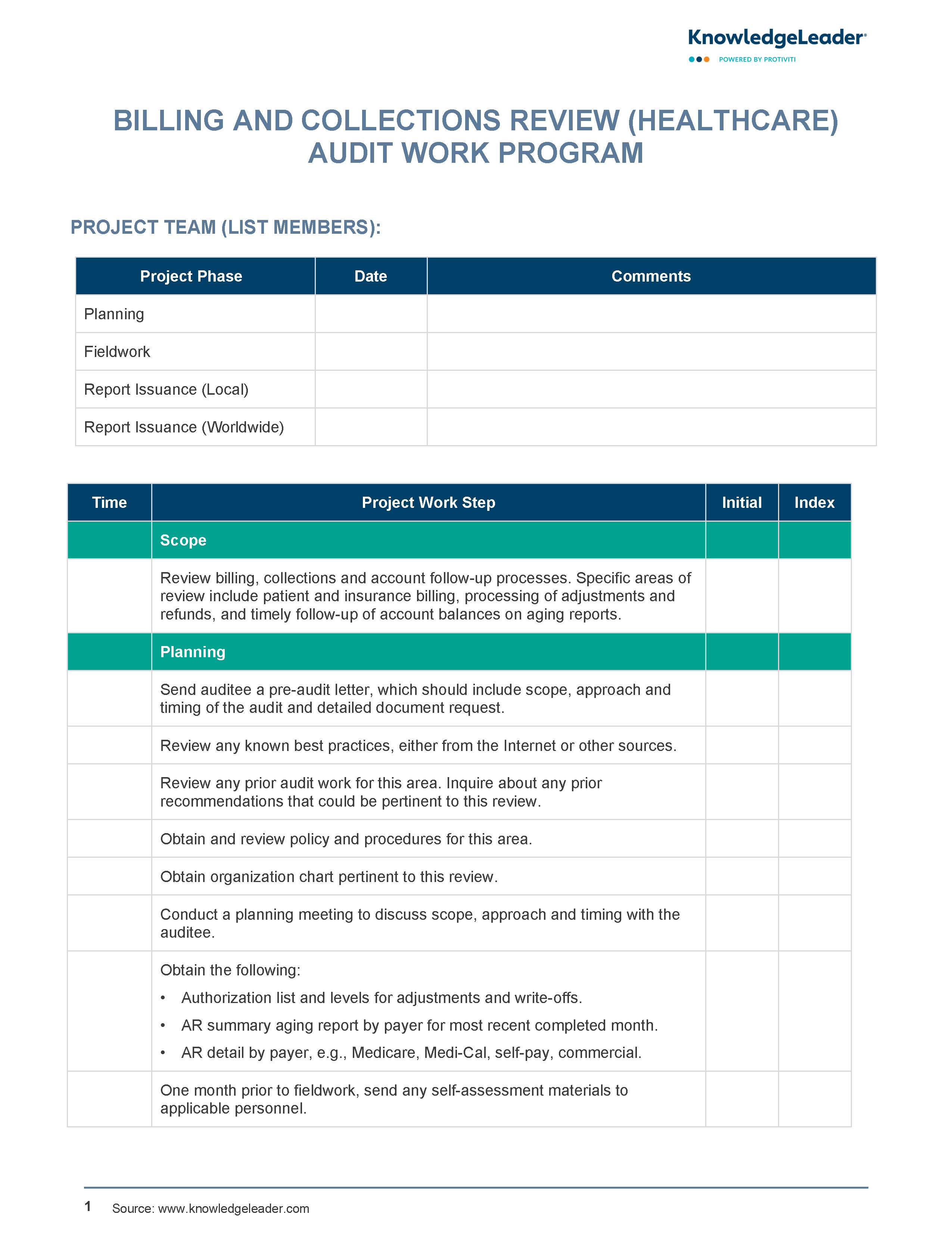 Review your billing, collections and account follow-up processes for a healthcare organization using this tool. This work program provides a structured approach for evaluating critical financial operations, ensuring compliance, minimizing revenue leakage, and optimizing accounts receivable management. This tool includes detailed guidance across key phases such as planning, fieldwork and reporting. It outlines steps for reviewing patient and insurance billing, adjustments, refunds, and aging reports.