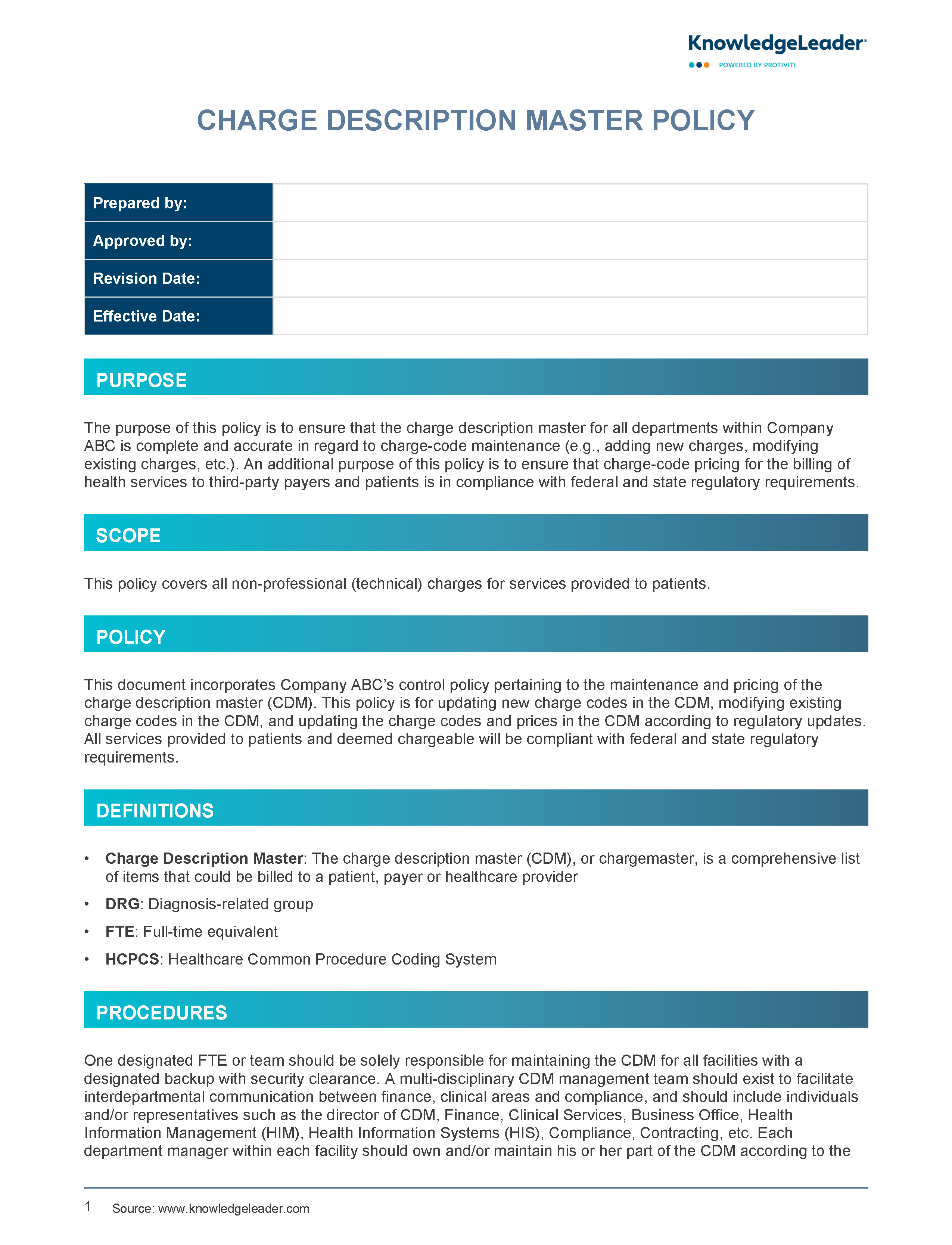 In this sample, the company’s control policy pertaining to the maintenance and pricing of the charge description master (CDM) is incorporated. This policy is for updating new charge codes in the CDM, modifying existing charge codes in the CDM, and updating the charge codes and prices in the CDM according to regulatory updates.