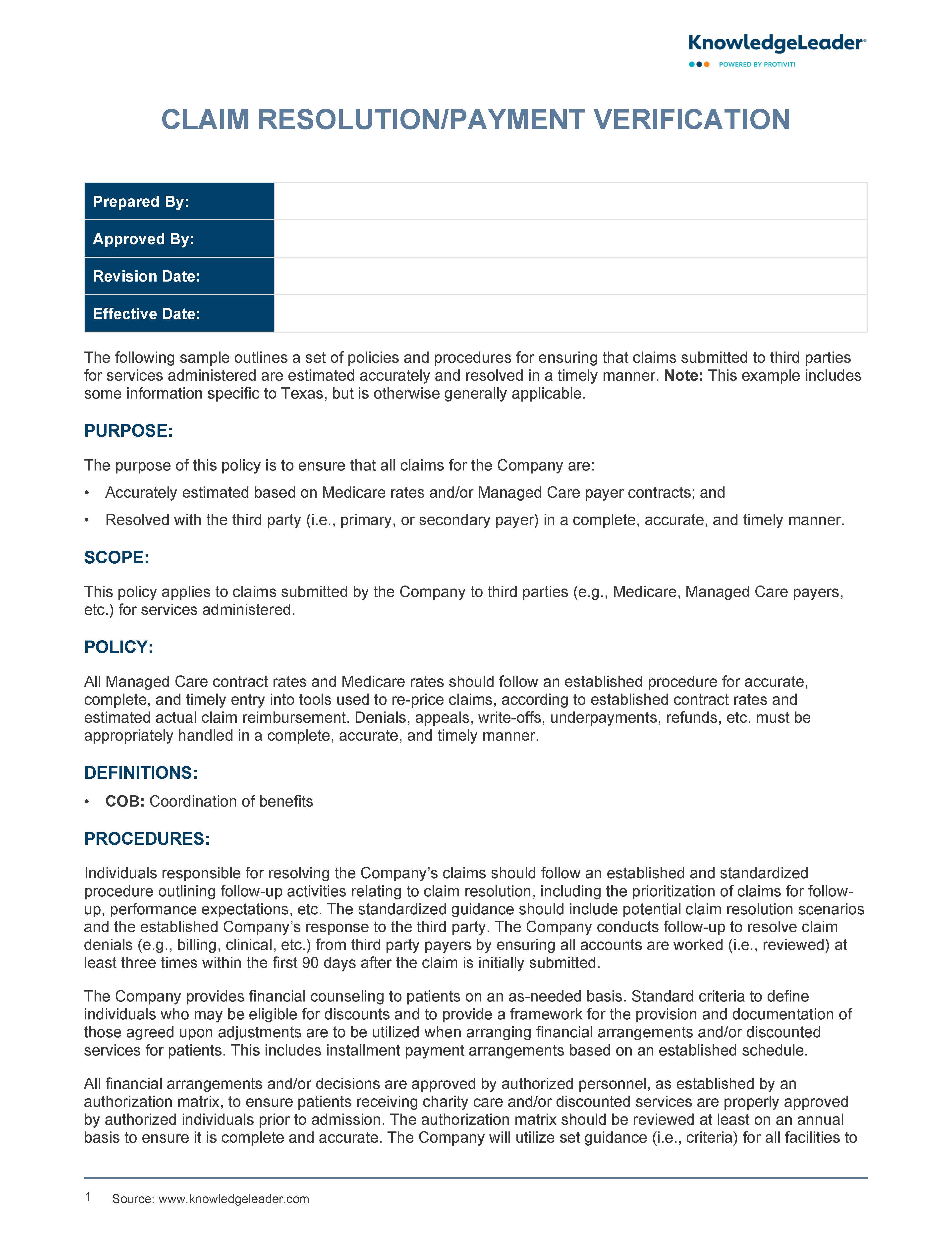 Claim Resolution/Payment Verification Policy