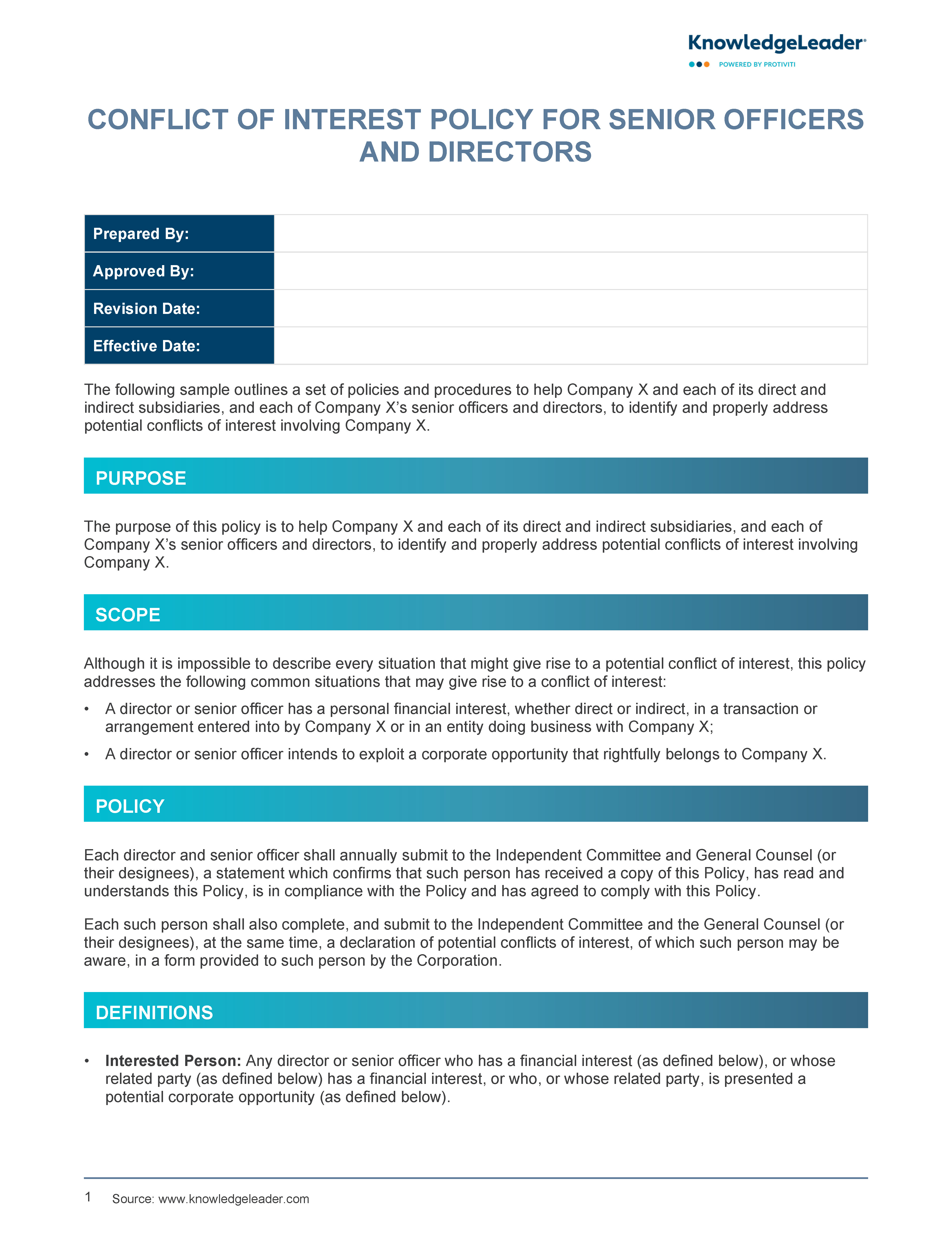 This Conflict of Interest Policy provides a structured approach for organizations to identify, address and manage potential conflicts of interest among all employees. Sample 1 is tailored for senior leadership and governance, while Sample 2 is broader, encompassing all employees and emphasizing operational protocols. Both samples underscore the importance of disclosure, transparency and adherence to ethical practices to safeguard the organization's integrity and reputation.