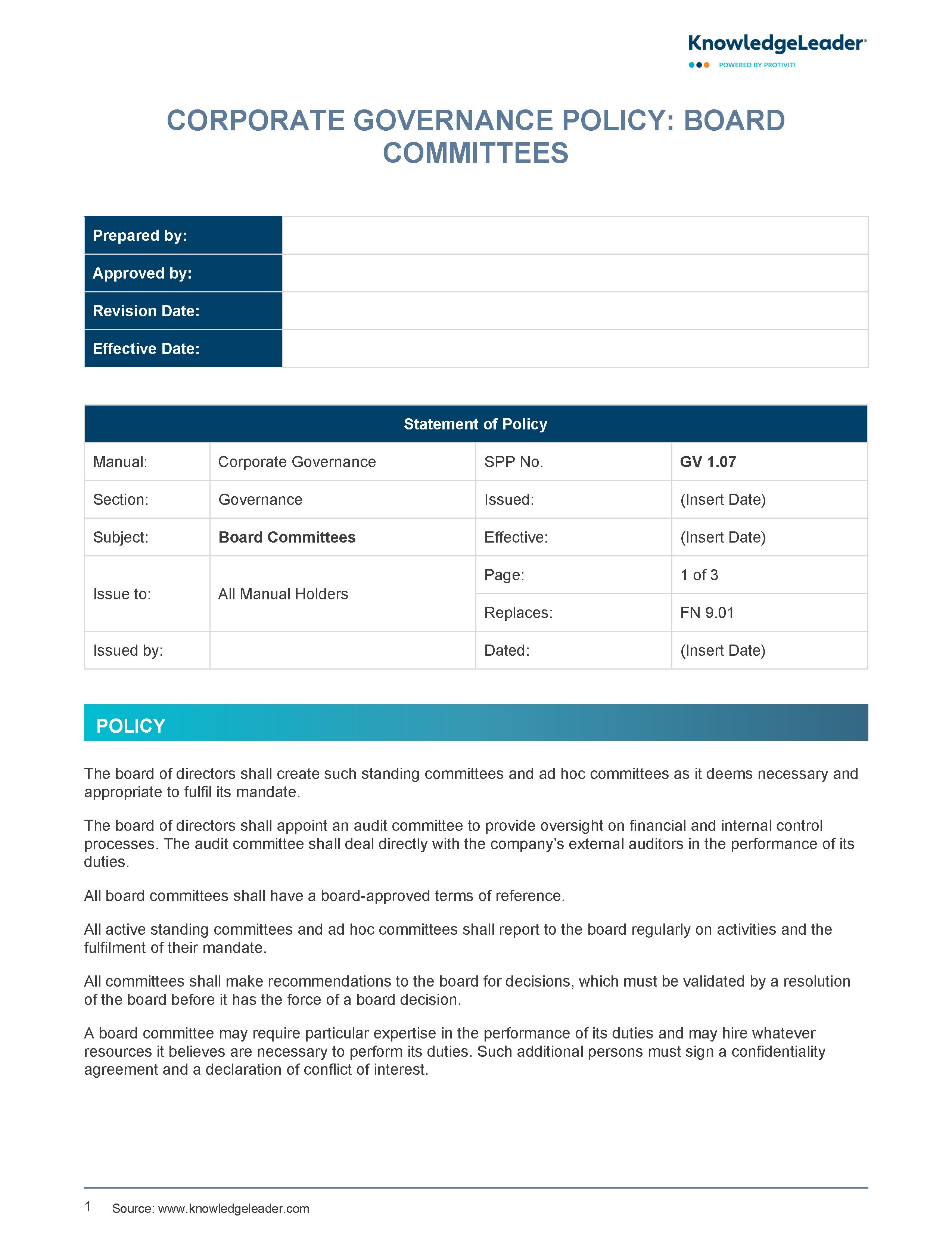 The purpose of this policy is to set standards for board committee structures and protocols. It applies to the board of directors and any external resources hired by the board.