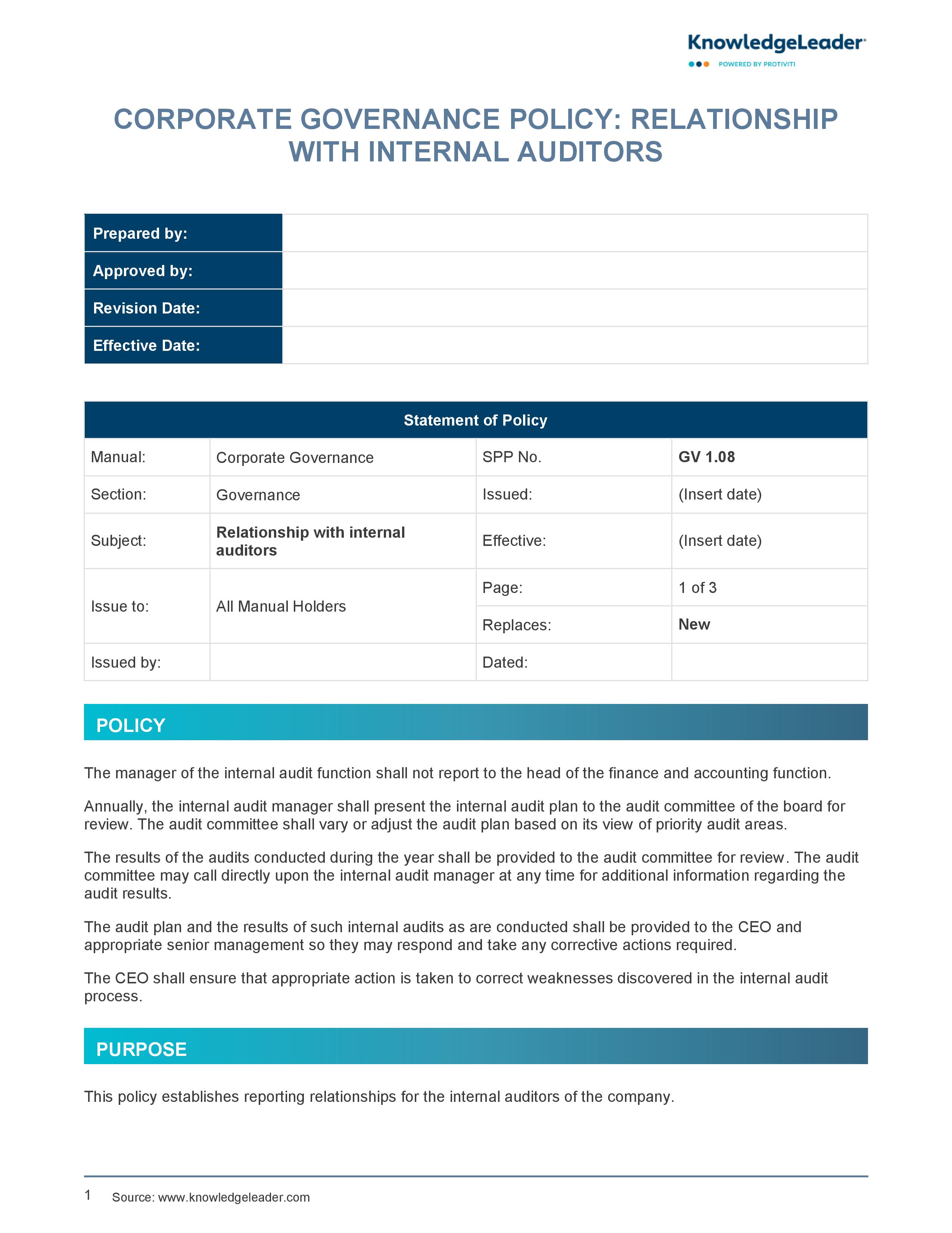 This sample policy establishes reporting relationships for the internal auditors of a company. It applies to the board of directors, the audit committee, the management of the company and the internal auditors.