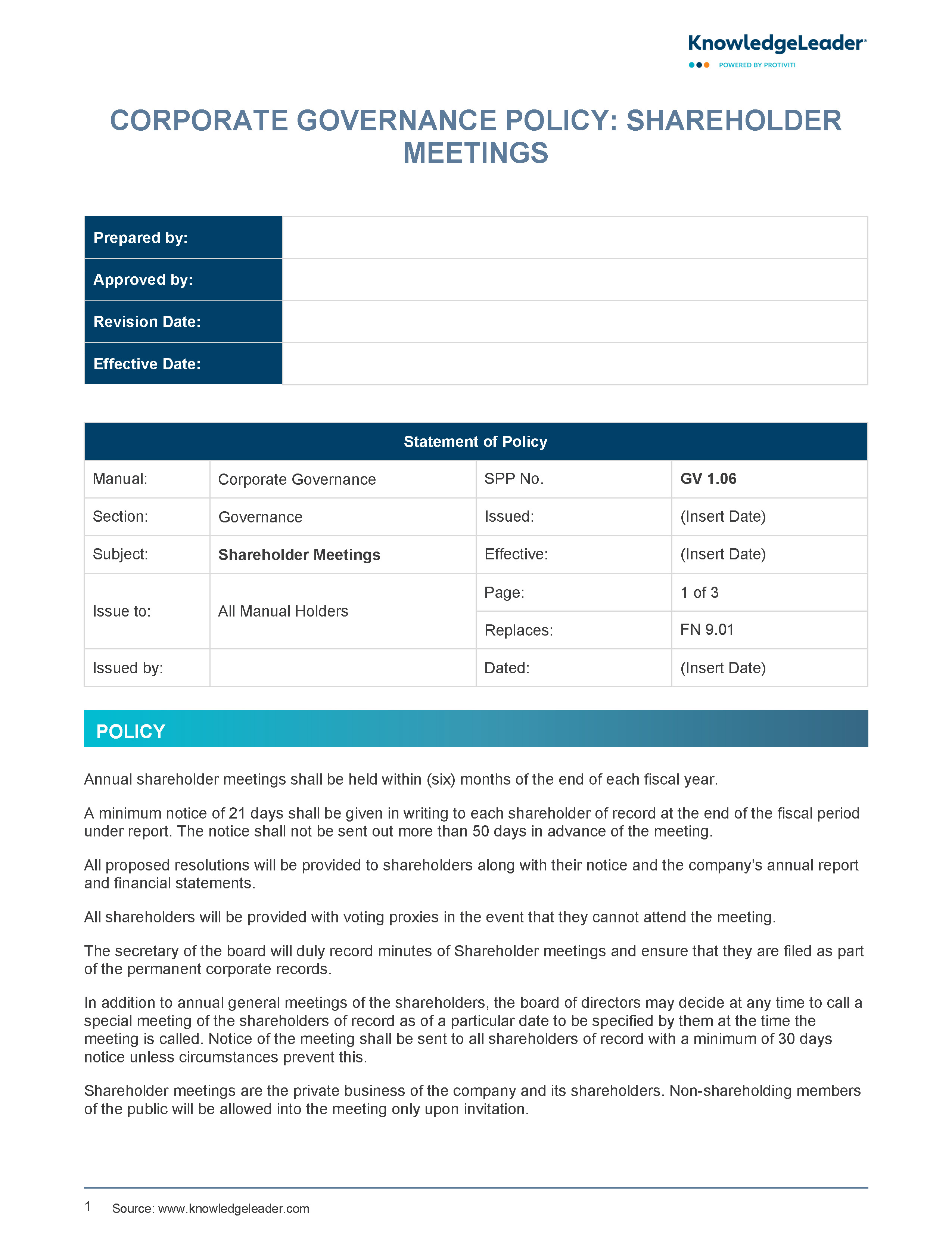 In this sample, annual shareholder meetings shall be held within six months of the end of each fiscal year. A minimum notice of 21 days shall be given in writing to each shareholder of record at the end of the fiscal period under report. All proposed resolutions will be provided to shareholders along with their notice and the company’s annual report and financial statements. All shareholders will be provided with voting proxies in the event that they cannot attend the meeting.