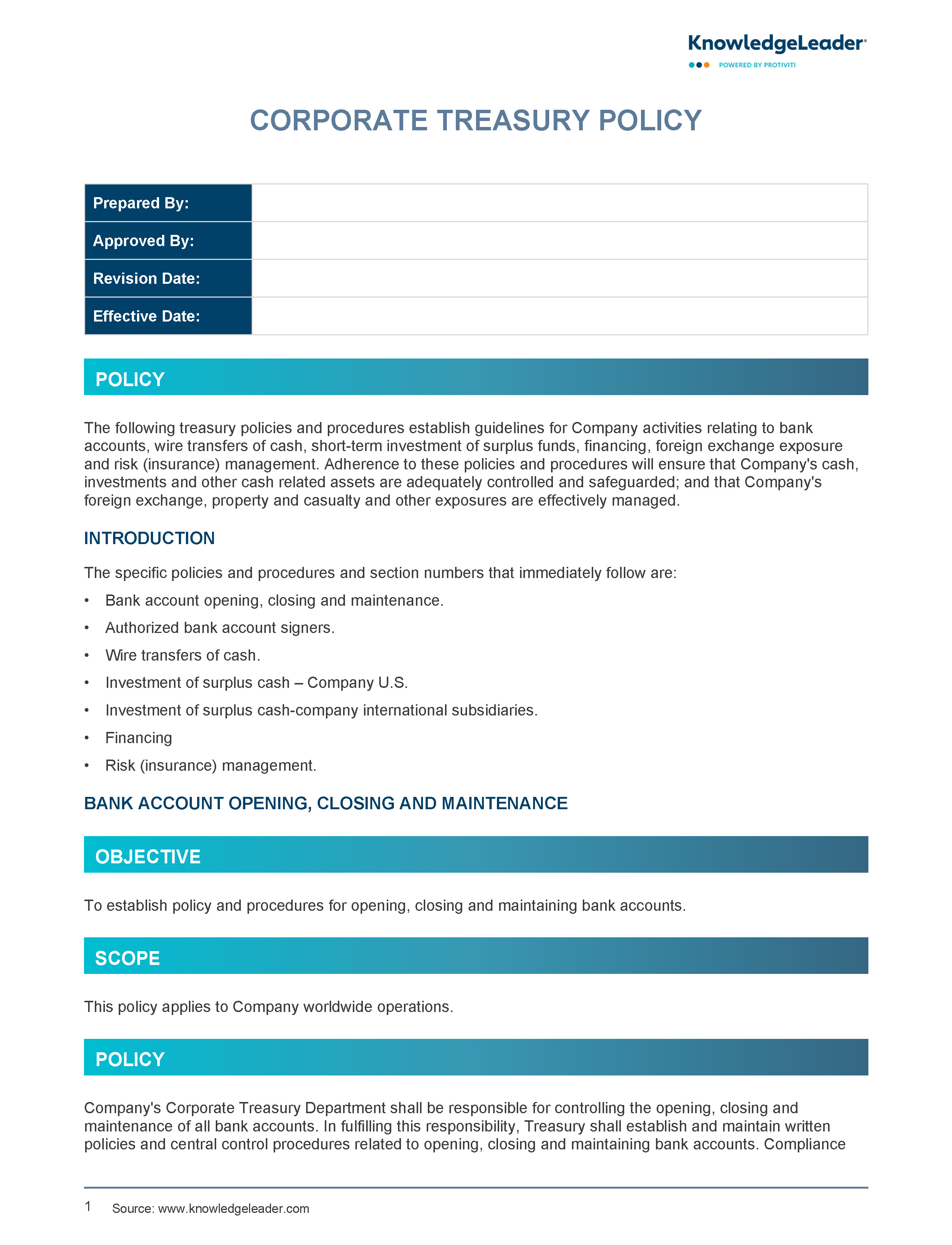 Our Corporate Treasury Policy serves as a guide for organizations aiming to enhance their treasury management practices. By providing a structured framework for managing treasury operations, this tool enables companies to effectively safeguard their financial assets while ensuring compliance with regulatory requirements. The policies and procedures detailed within this tool facilitate optimized cash flow management, risk mitigation and strategic investment decisions. With an emphasis on control, transparency and efficiency, this resource is essential for organizations seeking to fortify their financial governance and reduce exposure to risks.