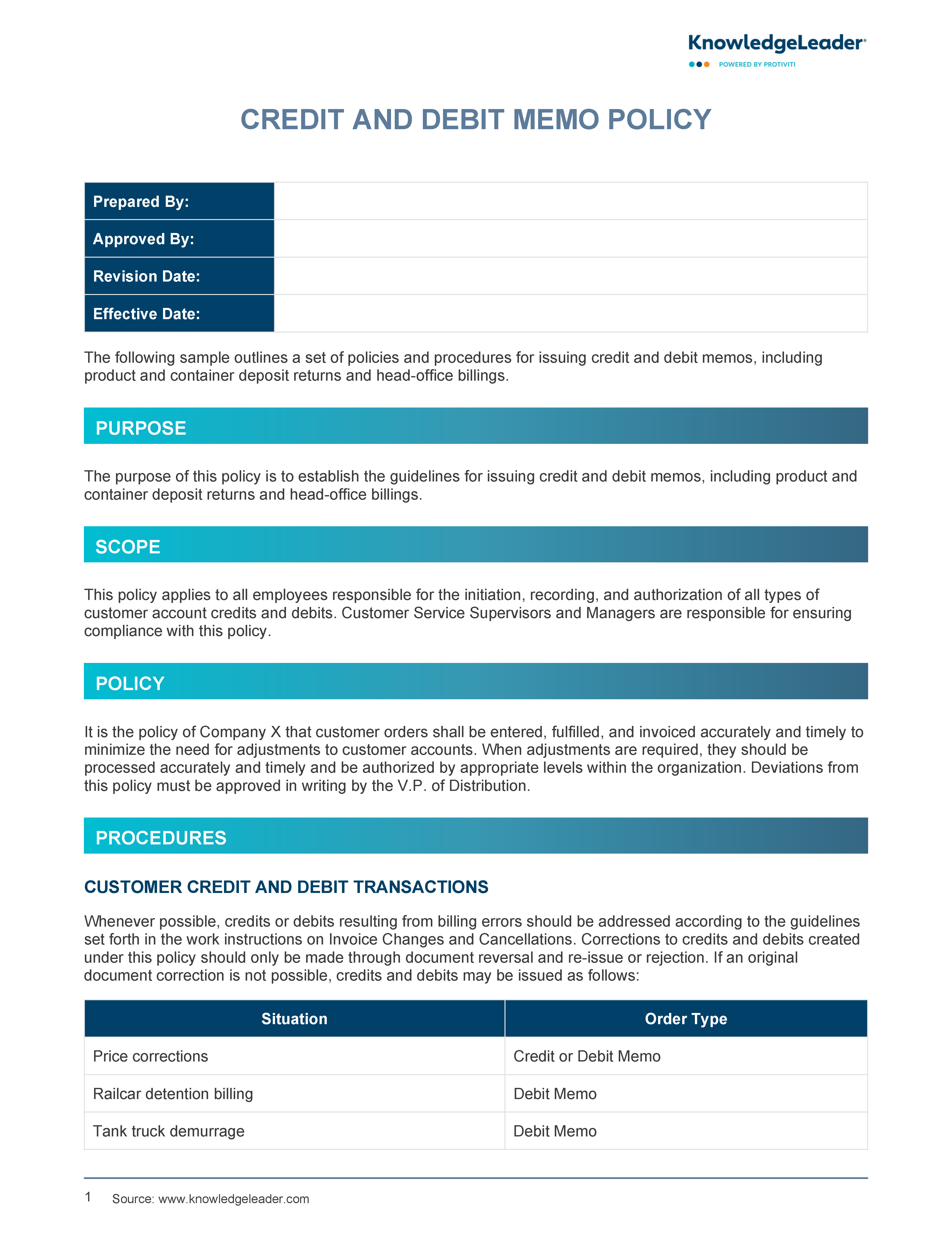 This policy outlines a set of procedures for issuing credit and debit memos. It includes procedures for product and container deposit returns and head-office billings. It applies to all employees responsible for the initiation, recording and authorization of all types of customer account credits and debits. Customer service supervisors and managers are responsible for ensuring compliance with this policy.