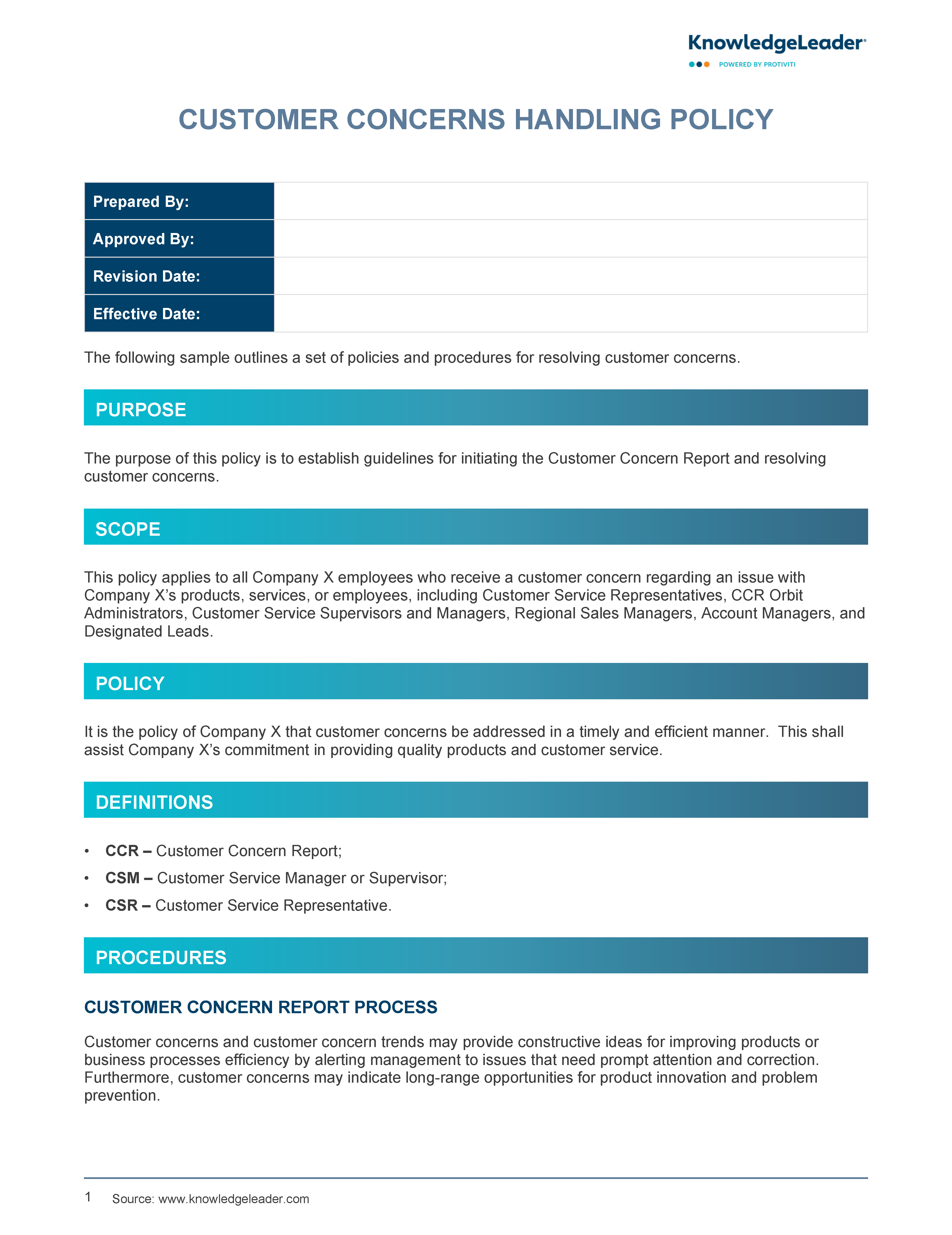 This policy applies to employees who receive a customer concern regarding an issue with company products, services or employees. It states that customer concerns should be addressed in a timely and efficient manner, which assists the company’s commitment to providing quality products and customer service. Customer concerns may provide constructive ideas for improving products or business process efficiency by alerting management to issues that need prompt attention and correction and may indicate long-range opportunities for product innovation and problem prevention.
