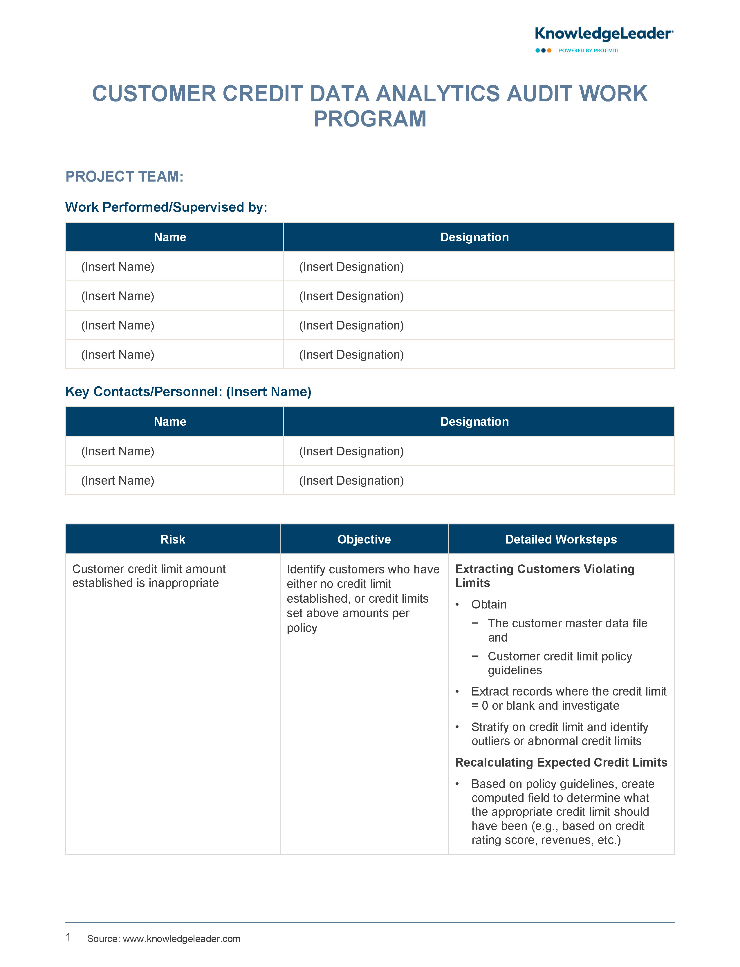 This seven-page work program utilizes data analytics to review steps in the customer credit process, including extracting customers who are violating limits, recalculating expected credit limits, extracting customer usage above credit, and identifying revenue reversals.
