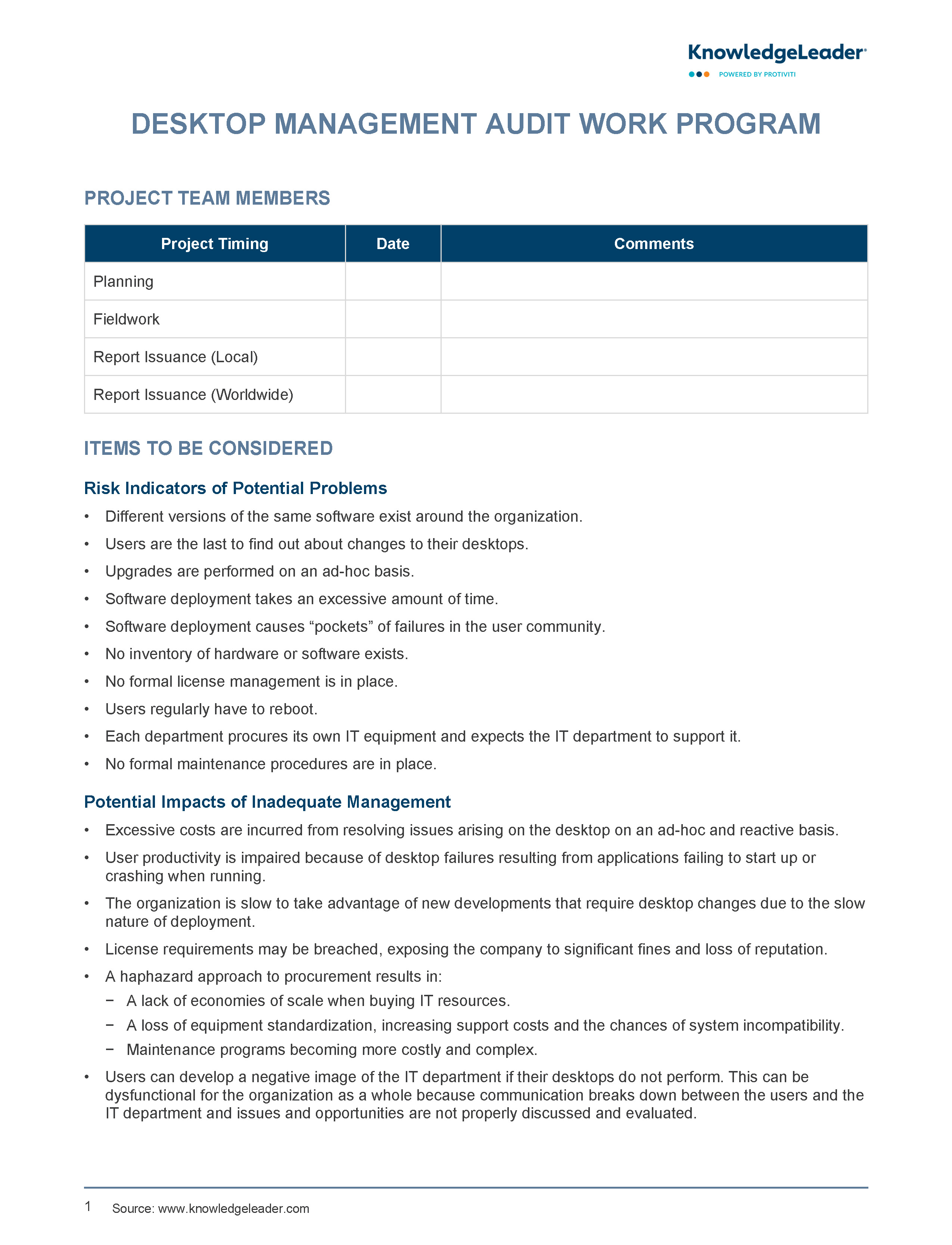 This sample desktop management audit work program document outlines steps to audit the process used to deploy software to desktop computers. The tool covers various critical areas, including risk indicators of potential problems, such as inconsistent software versions and lack of formal license management, and the potential impacts of inadequate management, like excessive costs and impaired user productivity. It also includes detailed project work steps for technology leverage, tactical alignment, stability and reliability, processes, results management, and human capital.