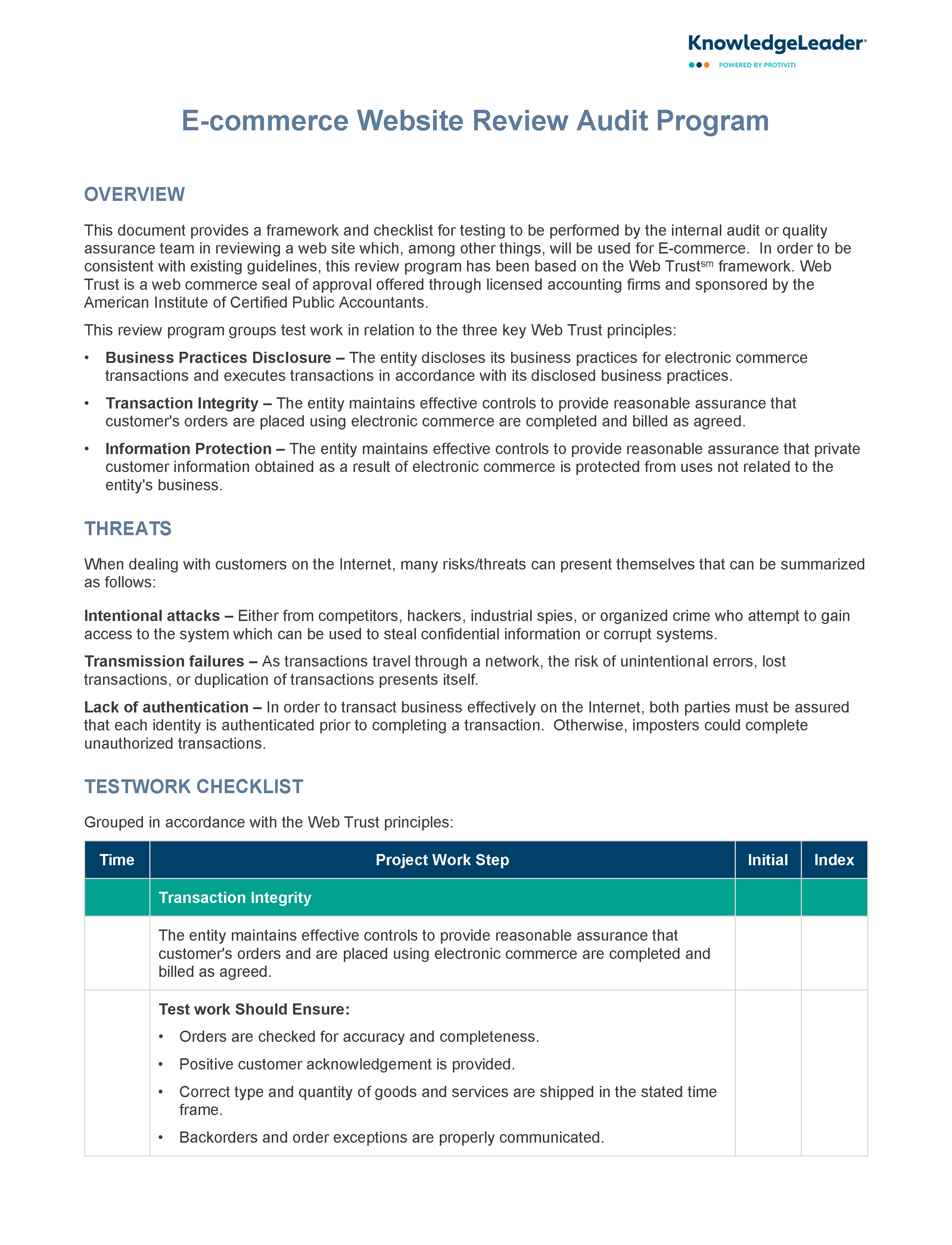 Perform effective audits of your e-commerce website with the attached E-Commerce Website Audit Work Program template.
