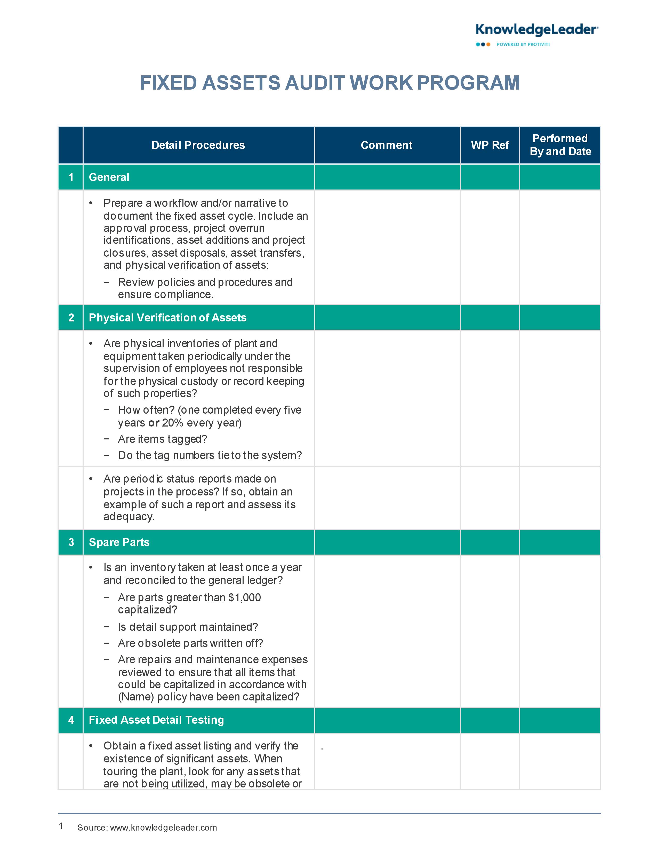The attached Fixed Assets Audit Work Program outlines the process of auditing fixed assets to ensure accurate capitalization, depreciation and accounting. The primary goal of this audit program is to maintain the integrity of financial statements. The document includes six samples, each with specific procedures and steps.