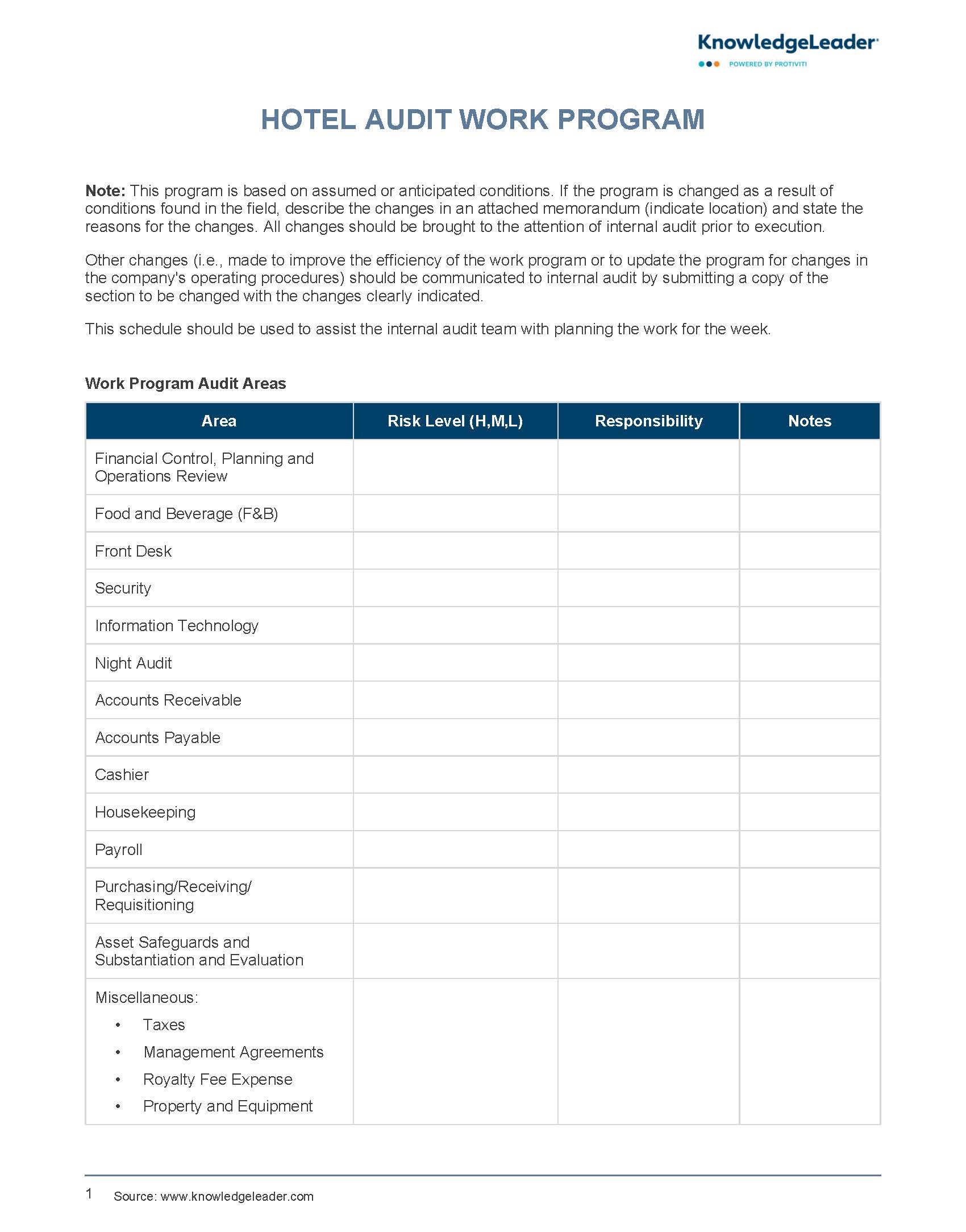 It also guides specific tests and reviews on areas like food and beverage operations, front desk activities, security measures, information technology systems, accounts receivable and payable, and more. It even includes sections for auditing management agreements, property and equipment, and other miscellaneous aspects. Leverage this work program to ensure thorough scrutiny of hotel operations, leading to valuable insights and recommendations that can enhance the hotel's overall performance, compliance and efficiency.