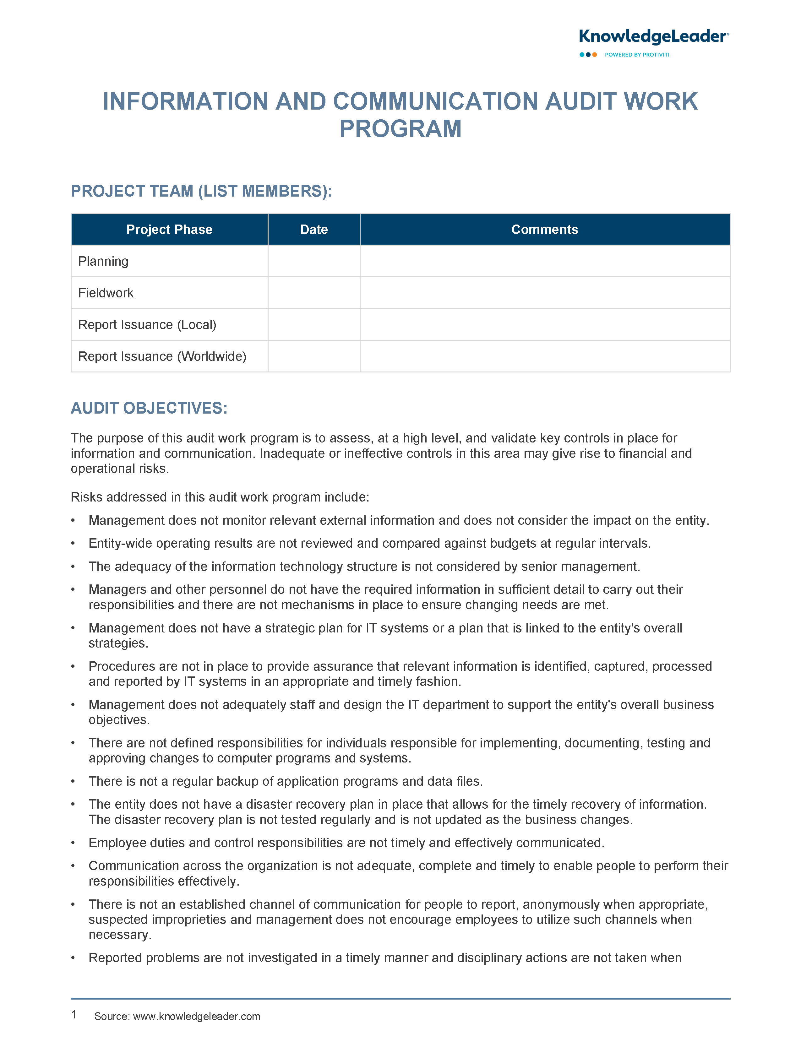 The purpose of this audit work program is to assess, at a high level, and validate key controls in place for the information and communication component of the COSO Framework. Inadequate or ineffective controls in this area may give rise to financial and operational risks.