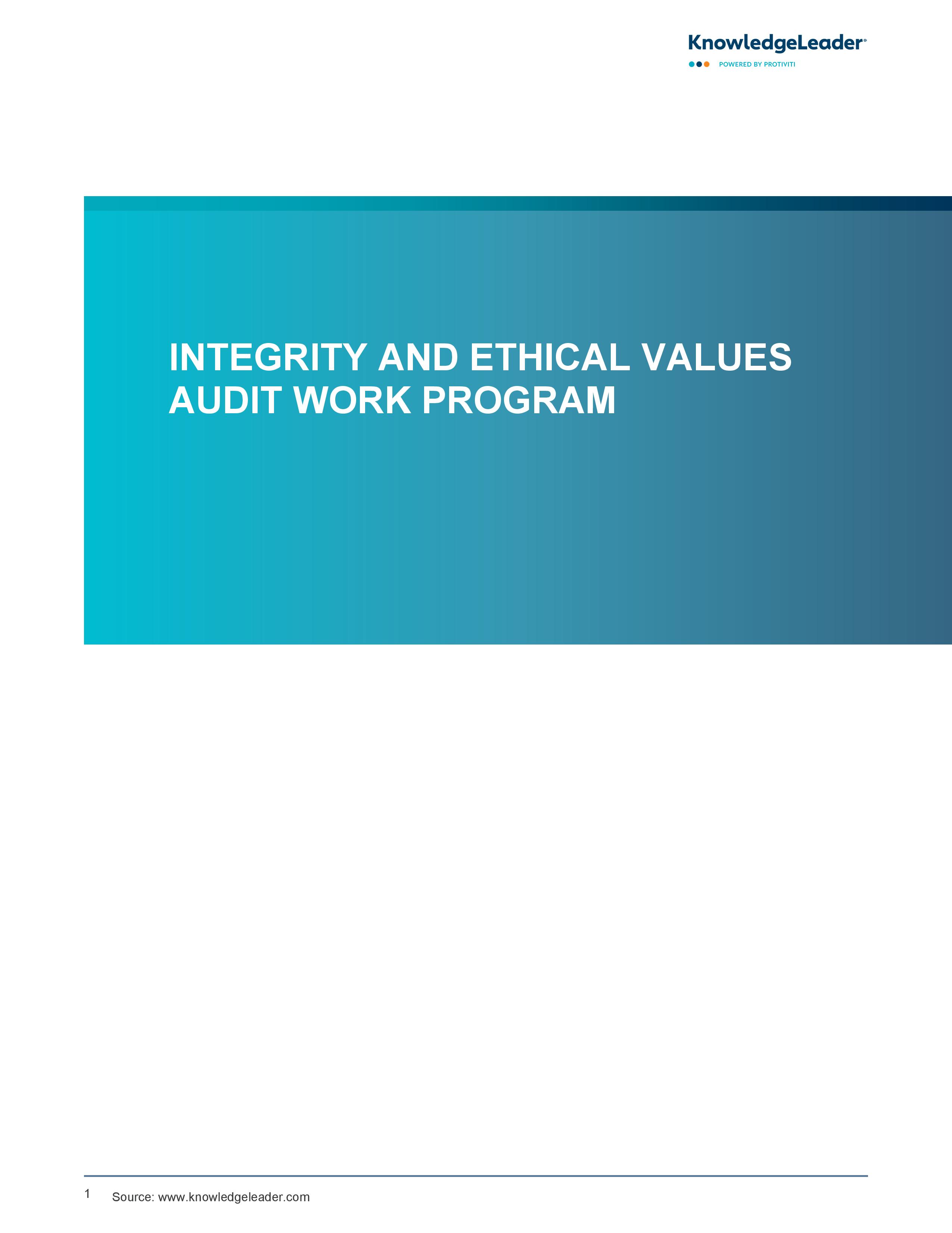 Our Integrity and Ethical Values Audit Work Program provides a framework for conducting audits focused on integrity and ethical values within an organization. It outlines various stages of the audit process, including planning, fieldwork and reporting. The planning stage emphasizes the importance of understanding the scope, approach and timing of the audit, as well as the necessity of collaborating with auditees. It also includes reviewing best practices for ethics compliance and incorporating relevant federal guidelines. The audit steps detail procedures for obtaining necessary documents such as the code of business conduct, organizational charts, and policies related to ethics and compliance.