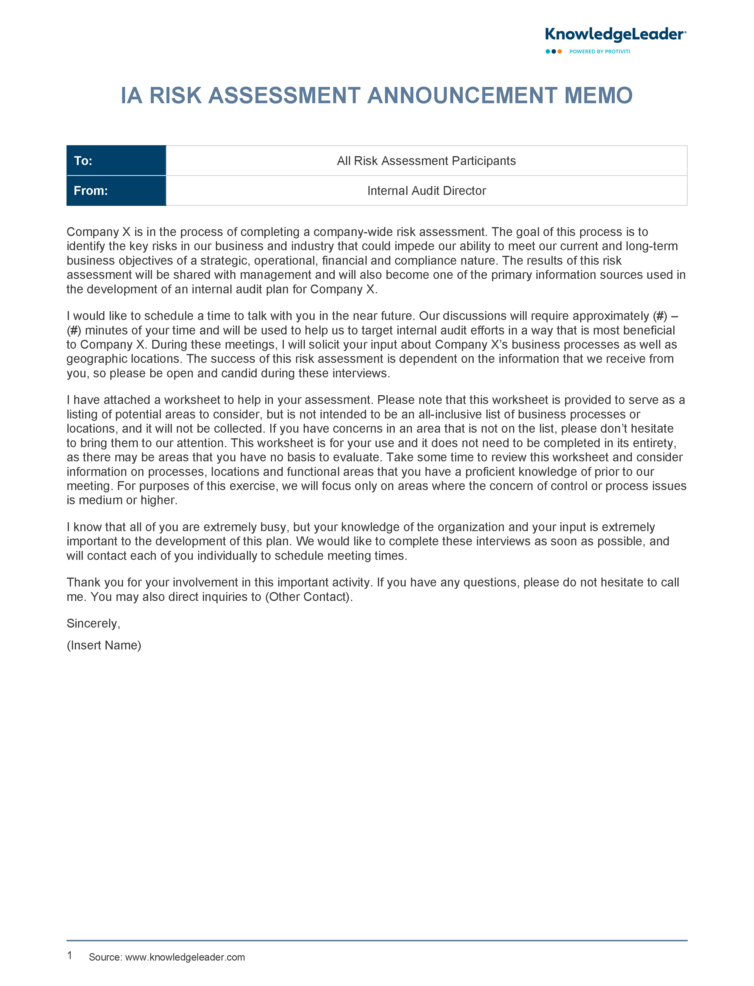 This sample letter from the internal audit director informs all participants of a companywide internal audit risk assessment and solicits their participation.