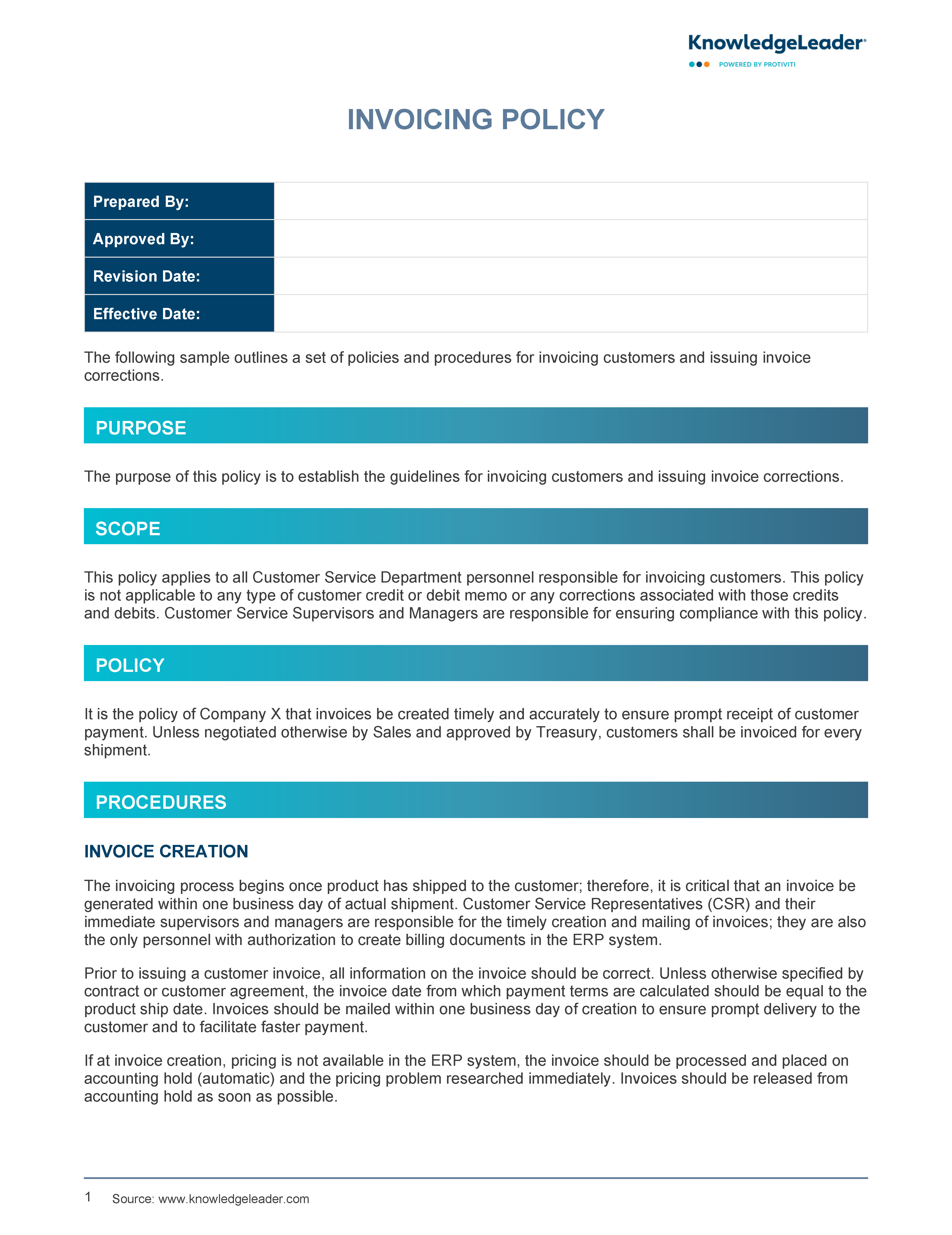 The following sample outlines a set of policies and procedures for invoicing customers and issuing invoice corrections. It applies to all customer service department personnel responsible for invoicing customers. This policy is not applicable to any type of customer credit or debit memo or any corrections associated with those credits and debits. Customer service supervisors and managers are responsible for ensuring compliance with this policy.