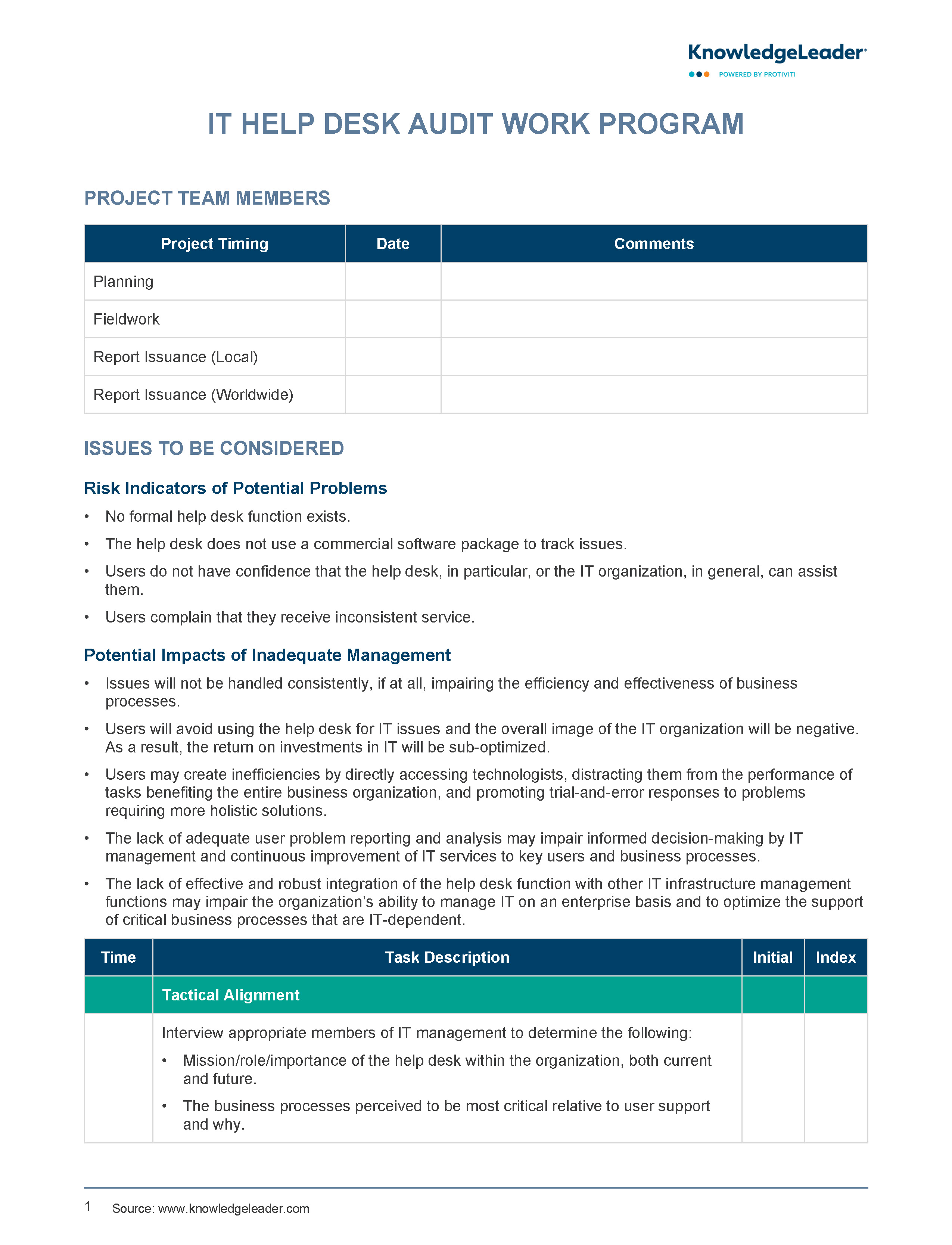 Ensure a smooth and efficient IT help desk process with this sample audit program. It outlines critical tasks such as assessing management's evaluation of user support, identifying help desk customers, and analyzing the staffing adequacy relative to user needs. Additionally, it emphasizes the importance of technology leverage, encouraging the examination of using help desk software for tracking and reporting issues.