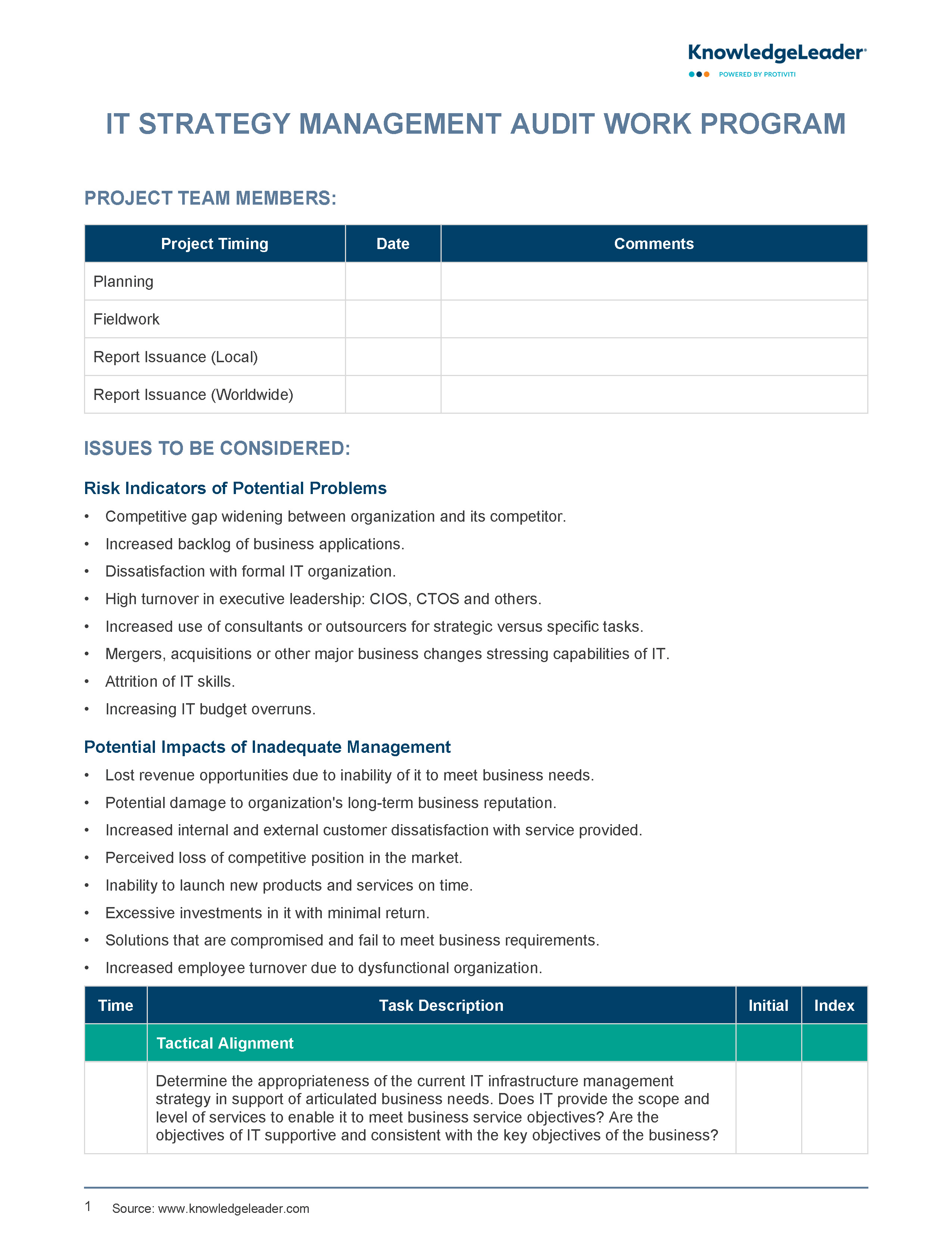 Our IT Strategy Management Audit Work Program is an essential tool for evaluating the effectiveness of your organization's IT strategy and its alignment with business objectives. This robust audit work program assists in identifying potential risk indicators such as competitive gaps, IT budget overruns and high executive turnover. It outlines critical areas for assessment, including the appropriateness of IT infrastructure management, IT's role within the company, flexibility and responsiveness to change, stability and reliability, communication processes, results management, and human capital.