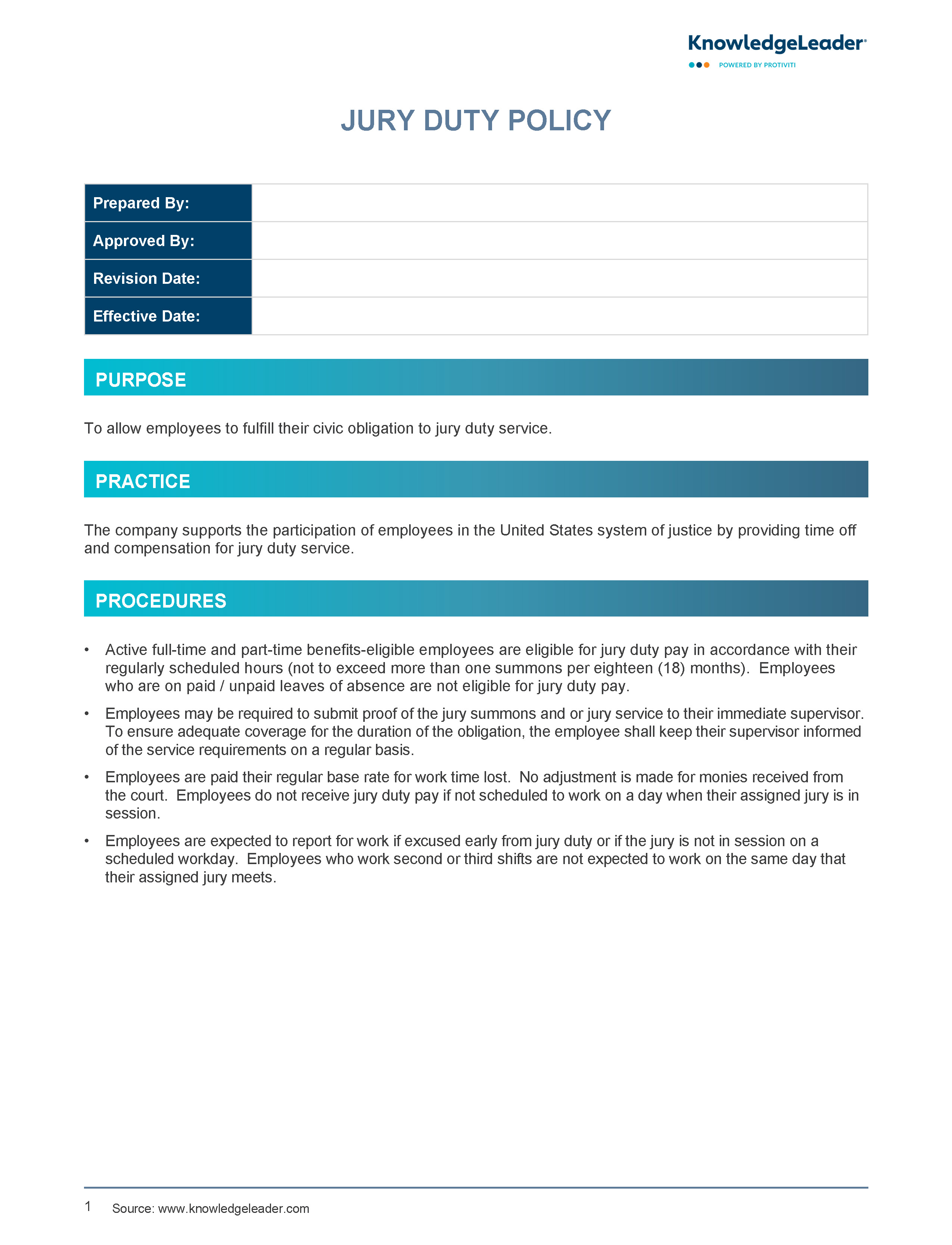 This policy states that active full-time and part-time benefits-eligible employees are eligible for jury duty pay in accordance with their regularly scheduled hours. Employees who are on a leave of absence are not eligible for jury duty pay. In addition, employees may be required to submit proof of the jury summons and or jury service to their immediate supervisor, and to ensure adequate coverage for the duration of the obligation, the employee should keep their supervisor informed of the service requirements regularly.