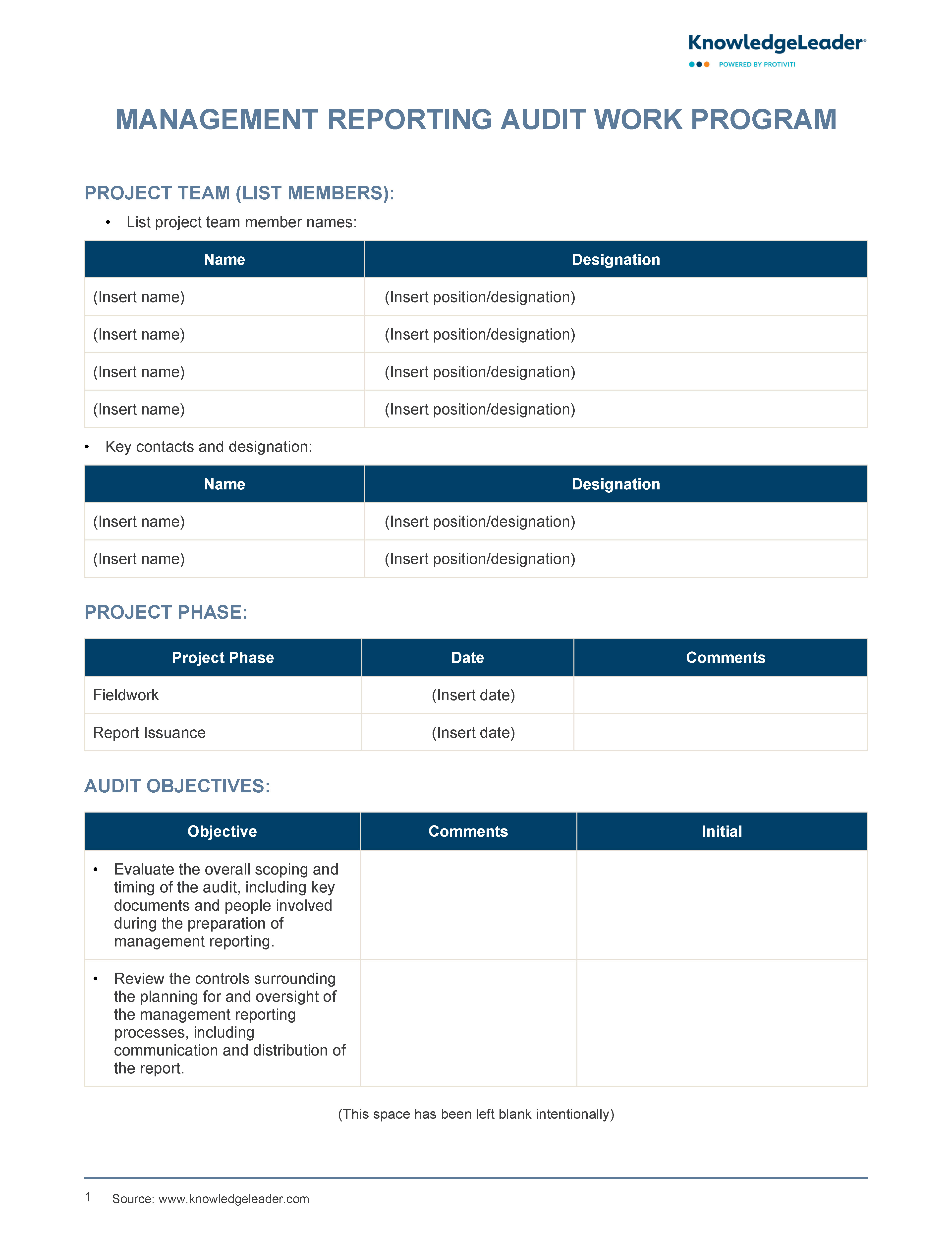 Our Management Reporting Audit Work Program serves as a guide for conducting audits on management reporting processes within an organization. It outlines the project's team members, key contacts, and critical phases such as fieldwork and report issuance. The audit objectives include evaluating the scope and timing of the audit, assessing controls over planning and oversight, and reviewing communication and distribution procedures of management reports. Detailed audit steps are provided to ensure a thorough examination of documentation, understanding of procedures, assessment of controls around report preparation and verification of data accuracy.