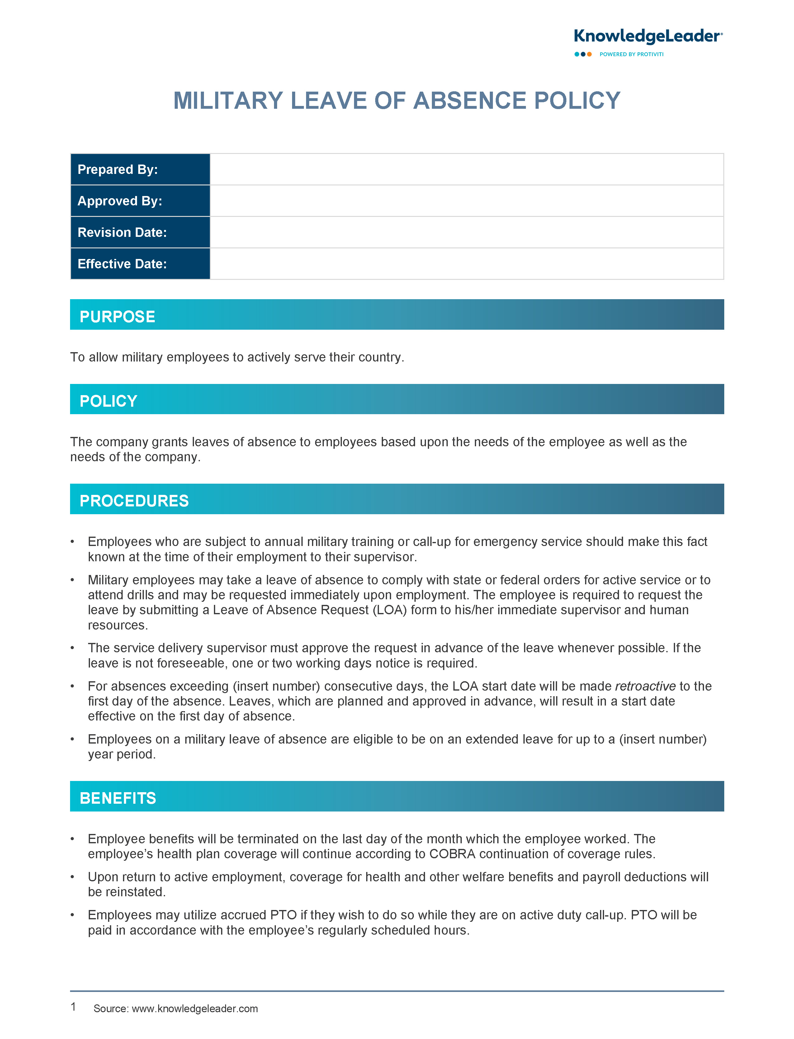 Under this policy, employees who are subject to annual military training or call-up for emergency service must make this fact known to their supervisor at the time of their employment, military employees may take a leave of absence to comply with state or federal orders for active service or to attend drills and may be requested immediately upon employment, and the service delivery supervisor must approve the request in advance of the leave whenever possible.