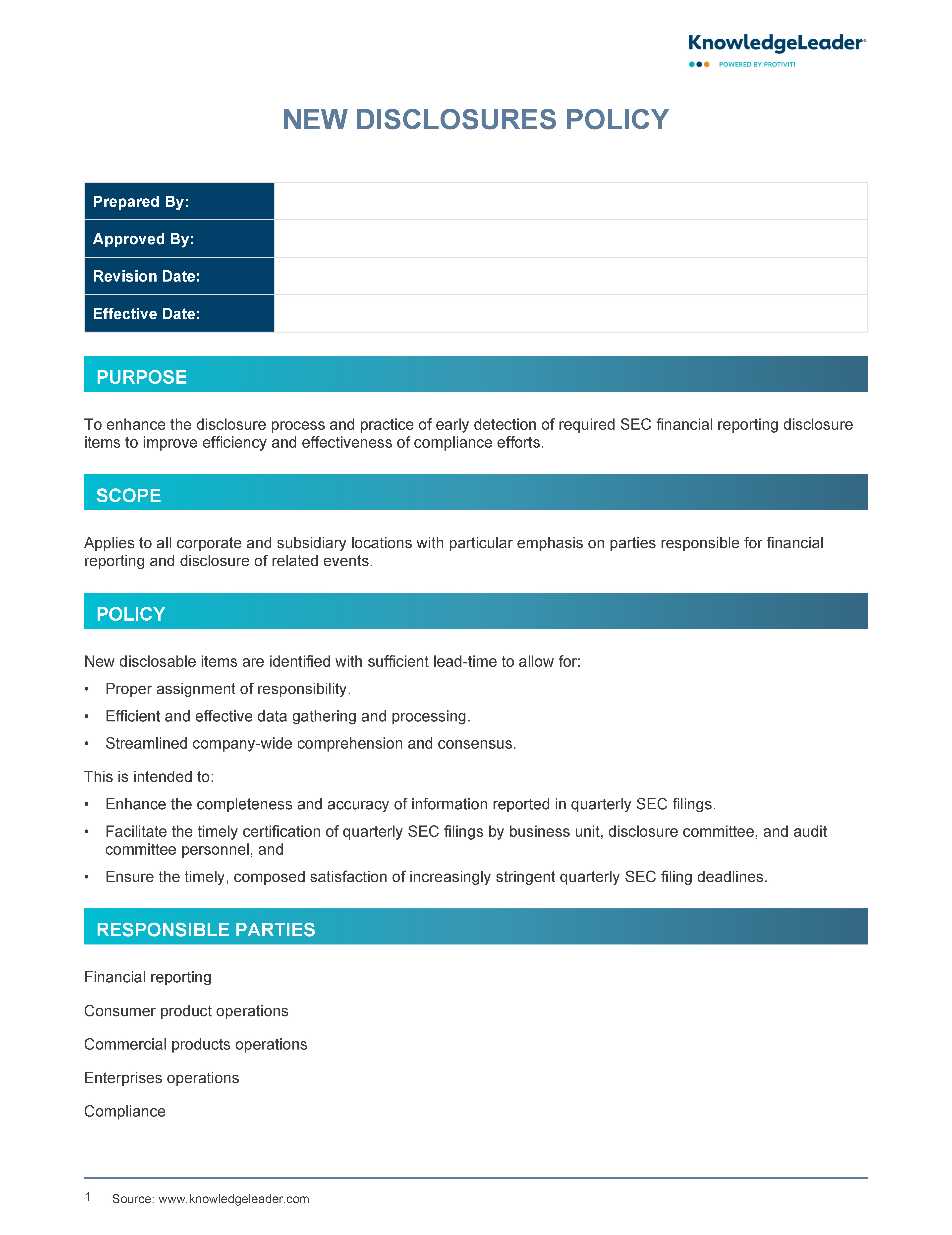 This New Disclosures Policy is intended to facilitate the early detection and disclosure of reportable items to the SEC and to improve the efficiency and effectiveness of compliance efforts. It applies to all corporate and subsidiary locations, with particular emphasis on parties responsible for financial reporting and disclosure of related events.