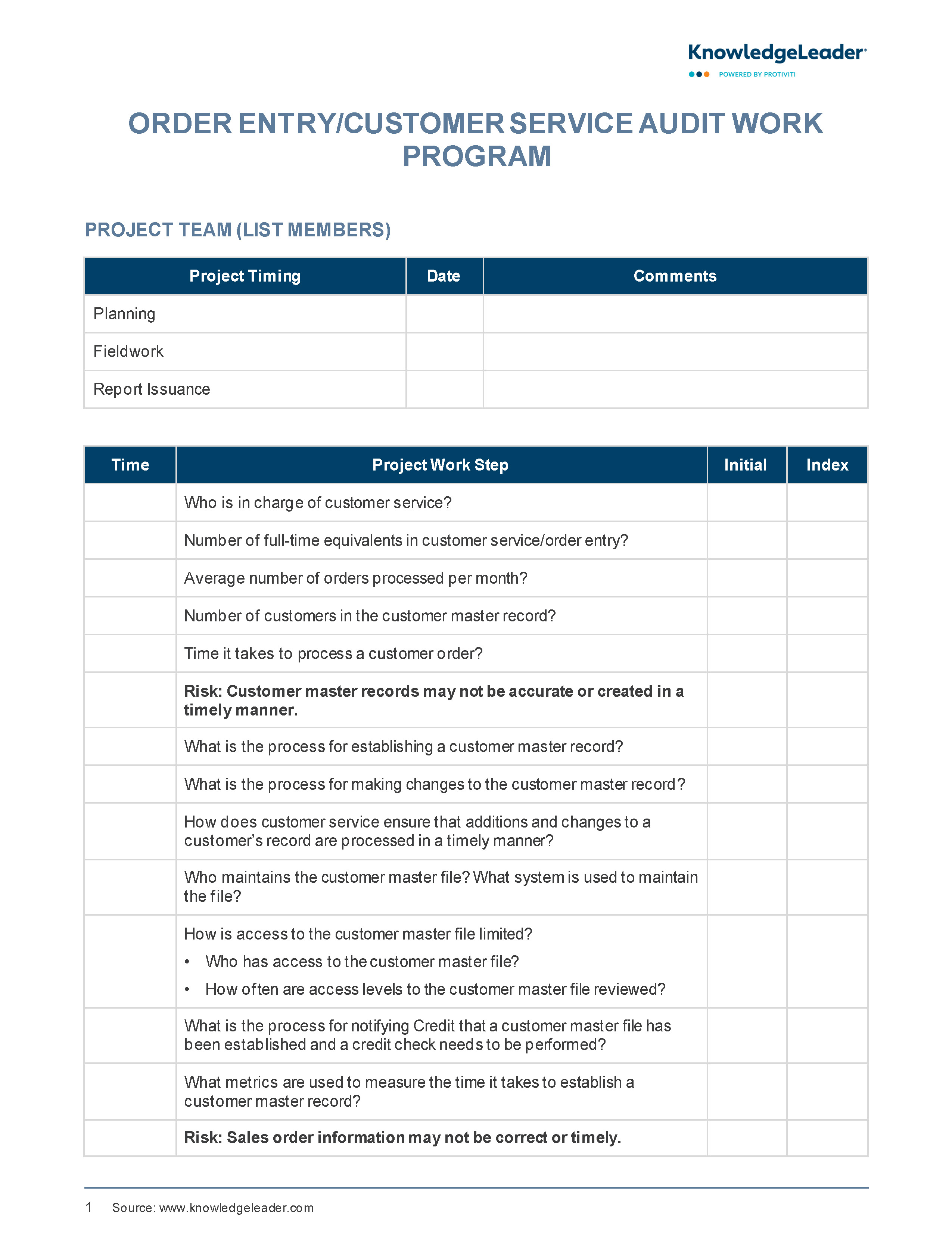 Facilitate your order entry and customer service process audits with the best practices in this audit program sample. It outlines detailed project steps, including planning, fieldwork and report issuance, aimed at evaluating the efficiency and accuracy of customer service operations. The document includes specific queries about the roles and responsibilities of customer service personnel, the average number of orders processed, and the time taken to process these orders.
