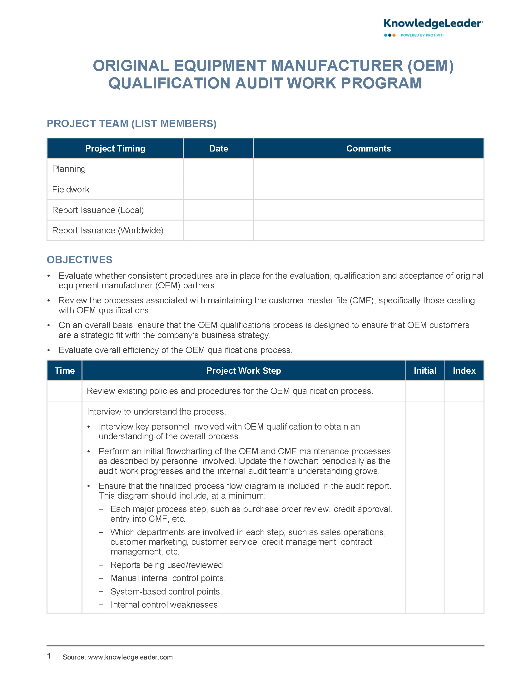 Original Equipment Manufacturer (OEM) Qualification Audit Work Program