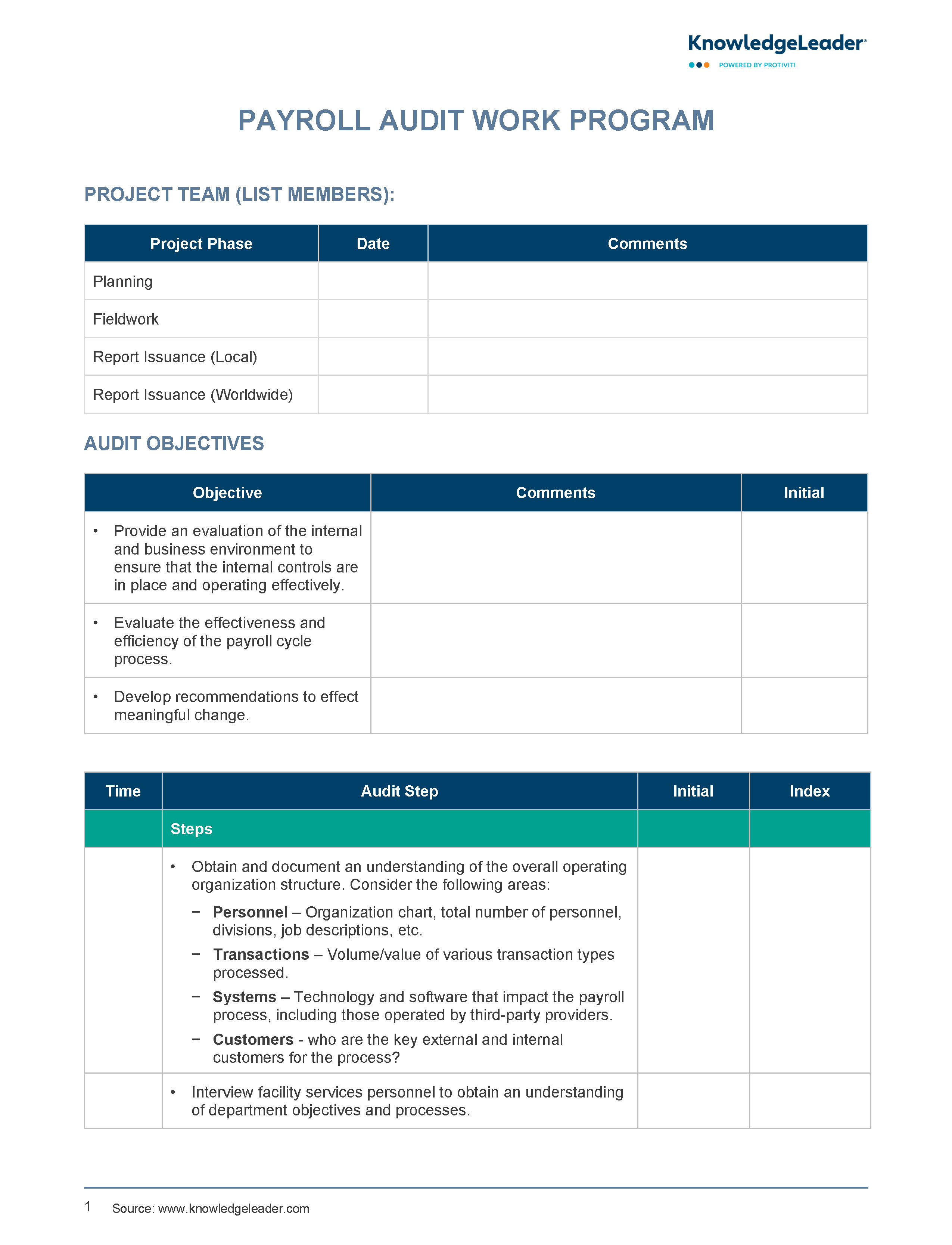 Our Payroll Audit Work Program provides a structured approach to conducting effective payroll audits, emphasizing their importance in verifying tax withholdings, identifying errors, preventing fraud and ensuring compliance with labor laws. It outlines key phases of the audit process, starting with gathering employee rosters and payroll reports and reconciling them against employee hours, payments and company accounts. This document highlights essential steps, such as reviewing internal controls, performing analytical procedures, interviewing personnel and issuing comprehensive audit reports. By conducting regular payroll audits, organizations can strengthen their financial integrity, identify areas for improvement and mitigate risks associated with payroll errors or fraud.