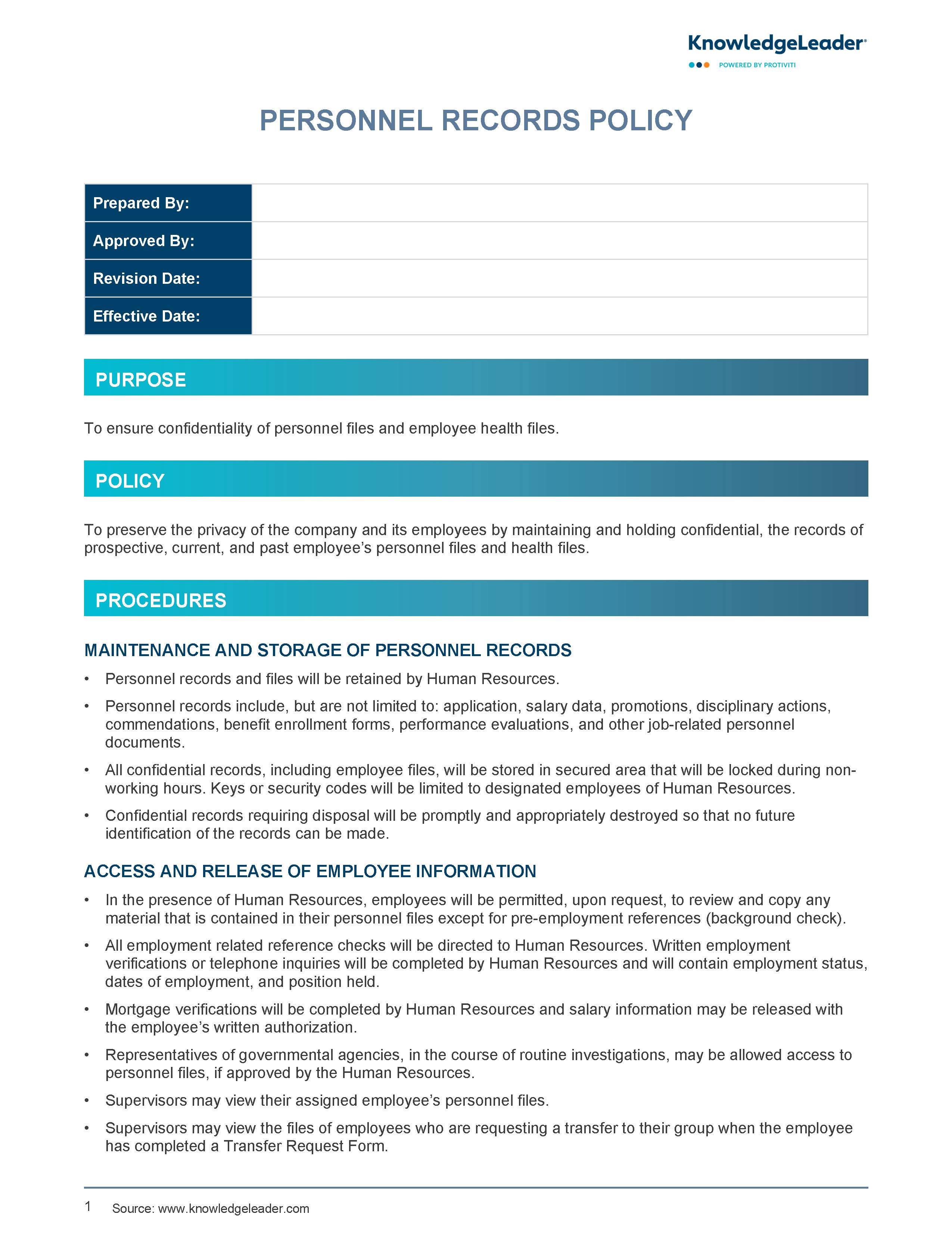 Access our personnel records policy for effective document retention and employee privacy management. The following sample outlines a set of policies and procedures to help preserve the privacy of the company and its employees by maintaining and holding confidential, the records of prospective, current, and past employee’s personnel files and health files.