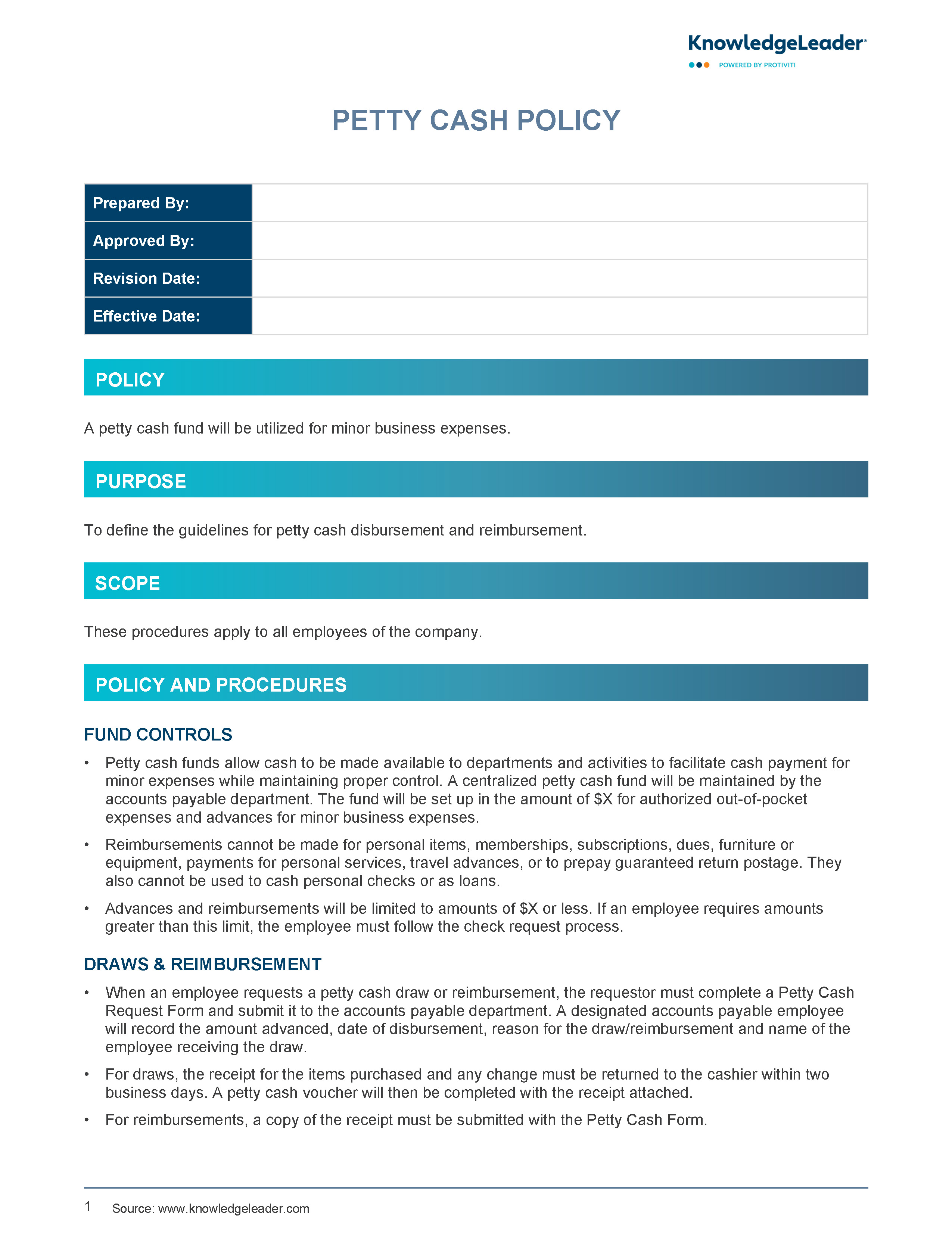 Define the guidelines for your organization’s petty cash disbursement and reimbursement process with this policy sample.