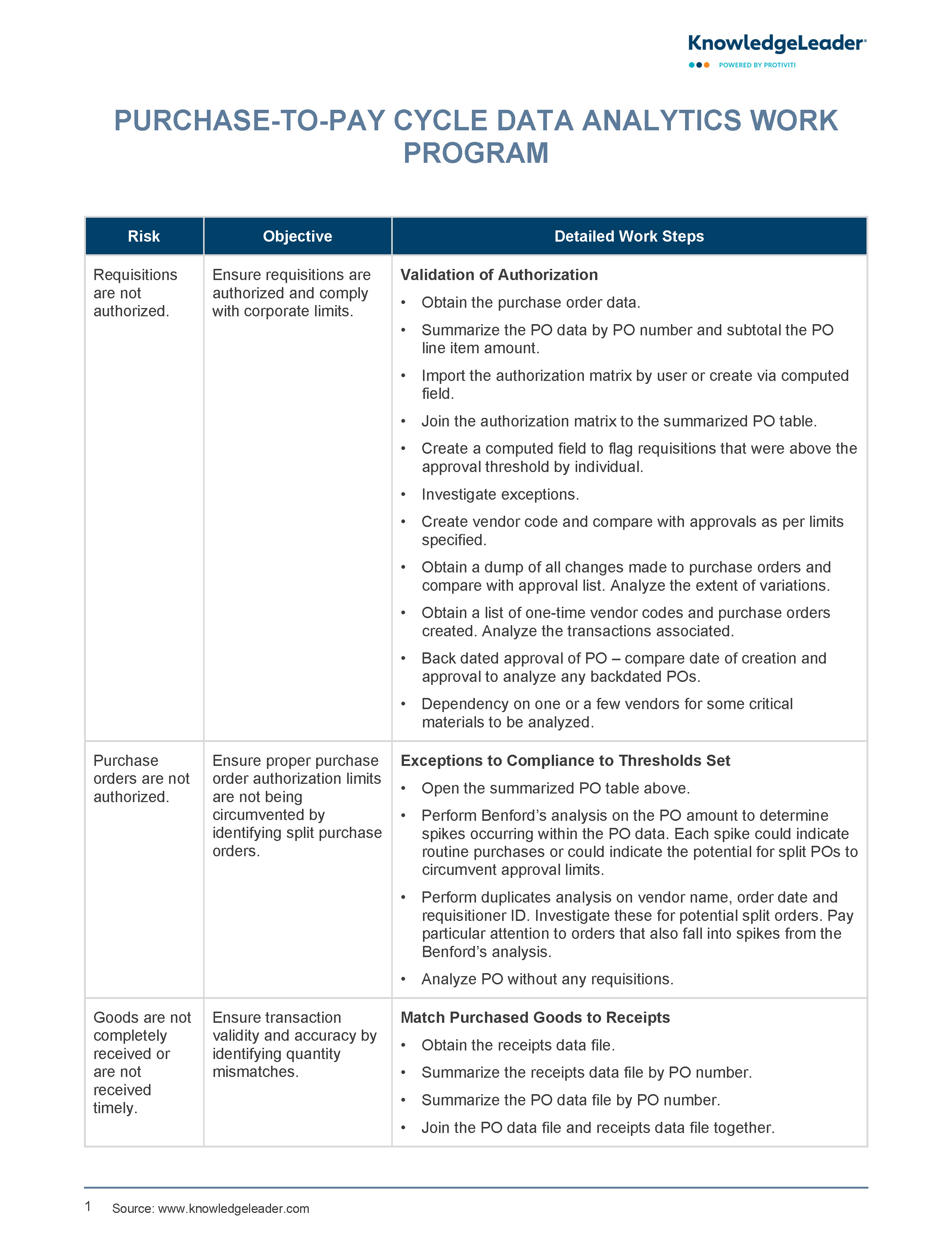 This six-page work program utilizes data analytics to review the purchase-to-pay cycle, including the following steps: authorization validation, exceptions to compliance thresholds, matching purchased goods to receipts and extracting payments that occurred on a weekend.