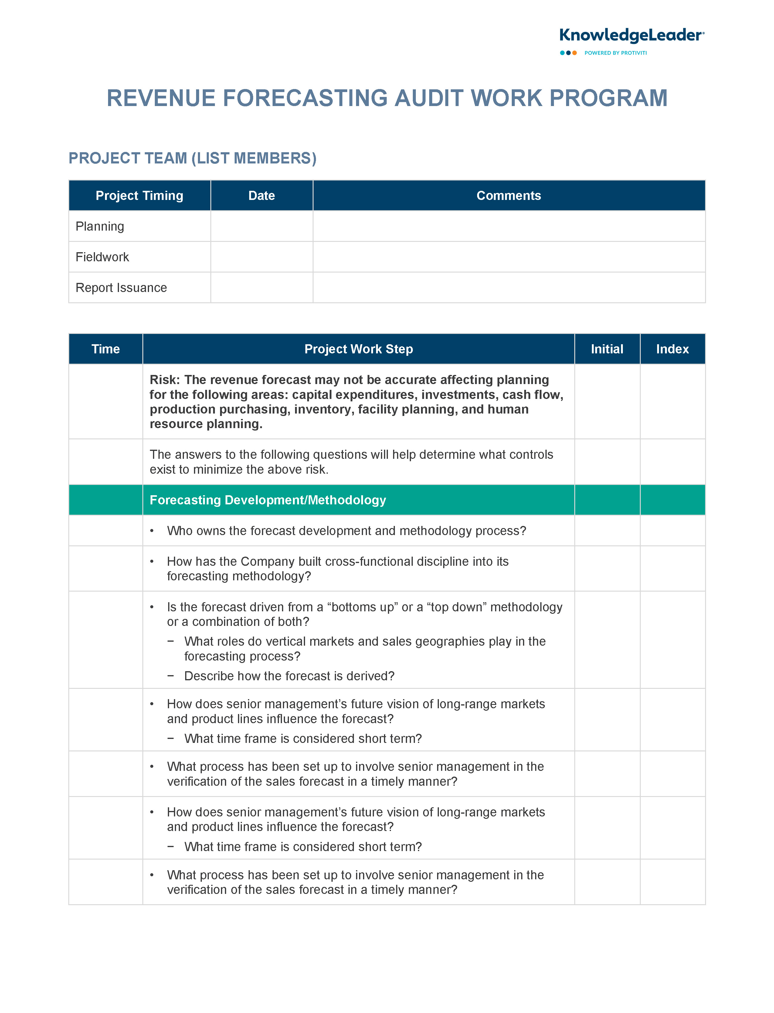 Our Revenue Forecasting Audit Work Program provides a comprehensive framework to assist in evaluating and improving the revenue forecasting process within an organization. It outlines a systematic approach for reviewing the development, methodology and execution of revenue forecasts. The document considers key questions about who owns the forecasting process, how it is updated, and what information is used to formulate forecasts.