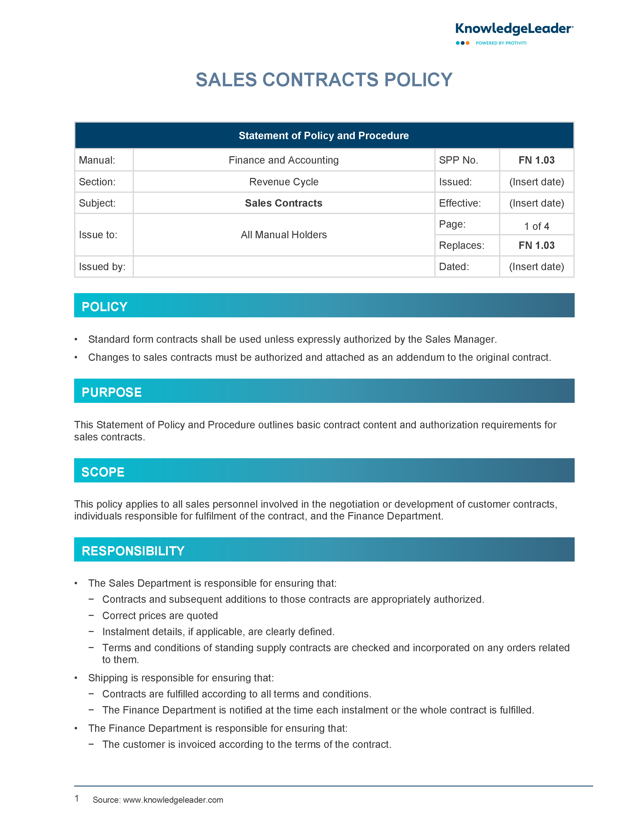 This statement of policy and procedure applies to all sales personnel involved in the negotiation or development of customer contracts, individuals responsible for fulfilment of the contract, and the finance department. It contains a list of responsibilities for the before mentioned personnel, as well as procedures for single sales contracts and standing supply contracts.