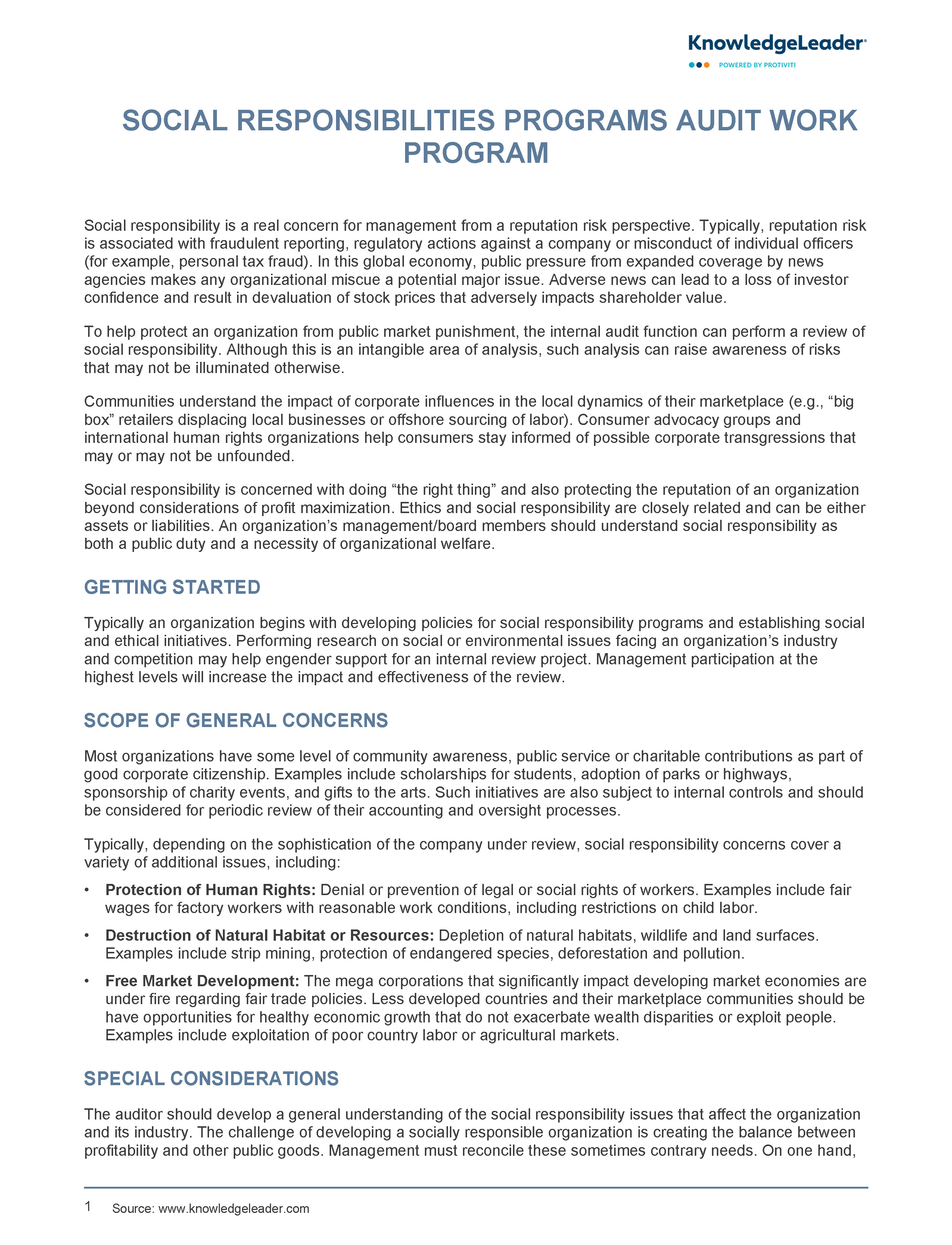 - Obtaining and reviewing the policies and procedures for social responsibility programs, including available roles and responsibilities