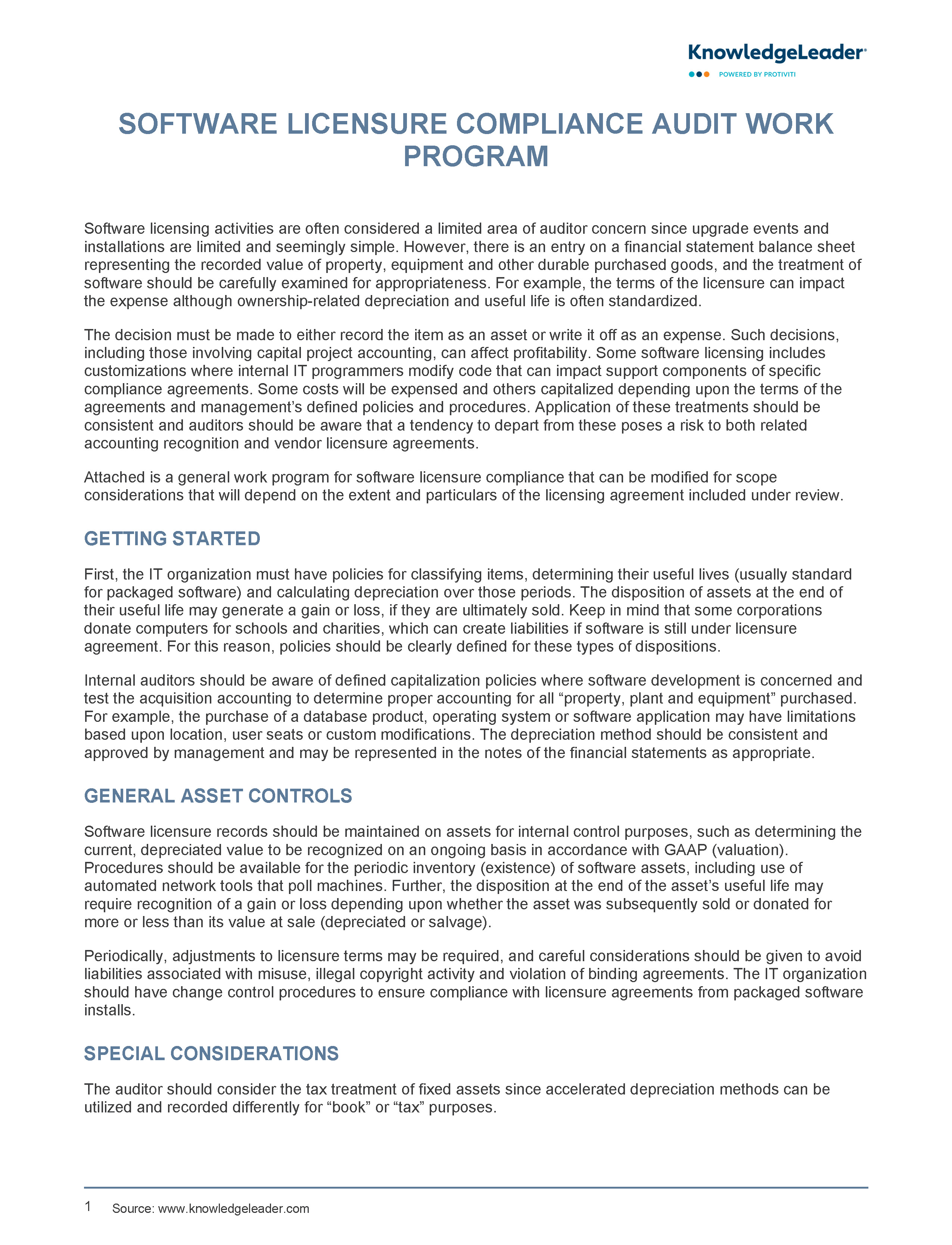 Additionally, it covers procedures for tracking licenses, acquiring upgrades and handling unlicensed software. The tool also highlights the need for periodic inventory checks, proper accounting for software assets and adherence to generally accepted accounting principles (GAAP). Special considerations include tax treatments, accelerated depreciation methods, and compliance with copyright laws to avoid legal and reputational risks. Overall, the work program provides the necessary steps and considerations to effectively evaluate and ensure software licensure compliance within an organization.
