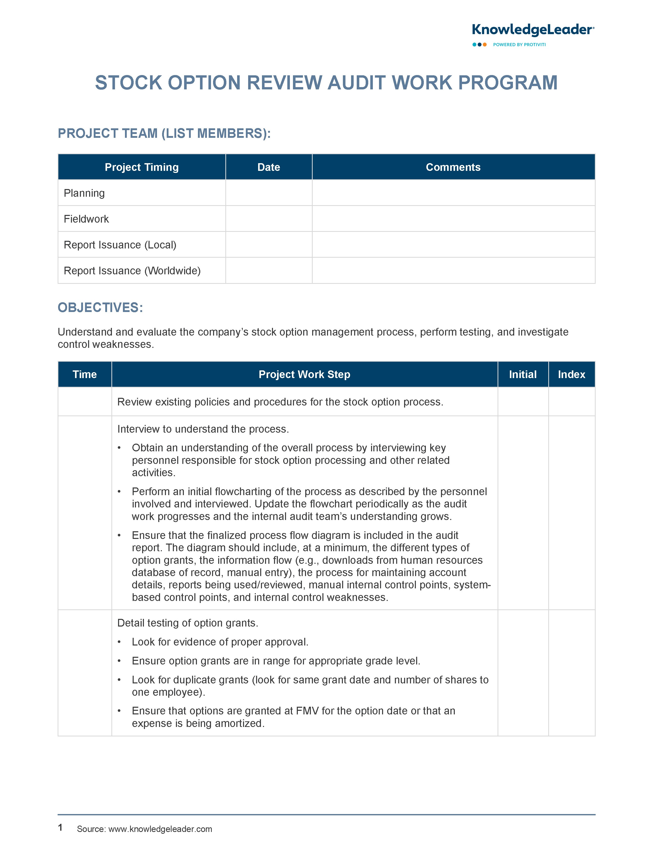 Understand and evaluate your company's stock option management process, performing tests, and investigating control weaknesses with this internal audit work program.
