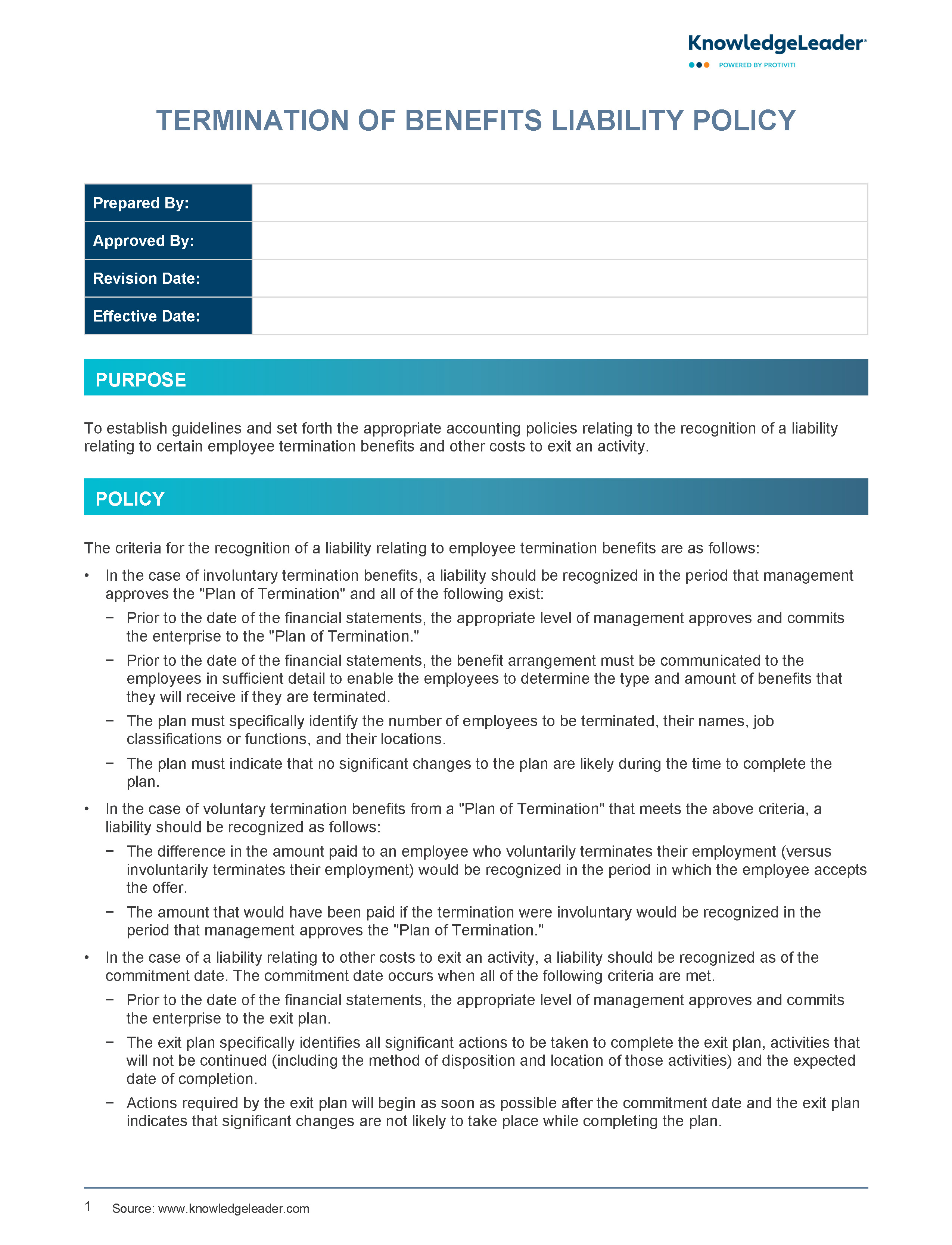 The policy mandates that management must approve and commit to a detailed termination plan before recognizing any related liability. This plan should specify affected employees, job classifications, functions and locations and confirm that no significant changes are anticipated during implementation.