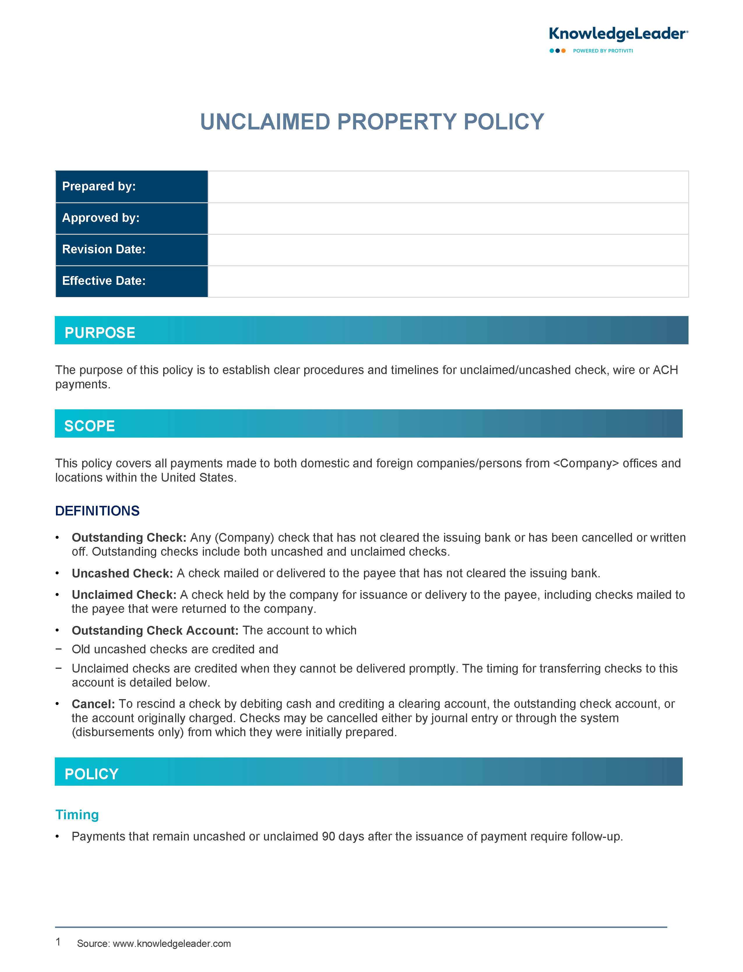 Our Unclaimed Property Policy outlines procedures for managing unclaimed or uncashed payments, ensuring compliance with state regulations. This sample defines key concepts such as outstanding checks, uncashed checks and escheatable funds, while detailing the responsibilities of various departments within the organization. It emphasizes timely follow-up on unclaimed payments, mandates the transfer of stale-dated checks, and provides a framework for remitting unclaimed property.