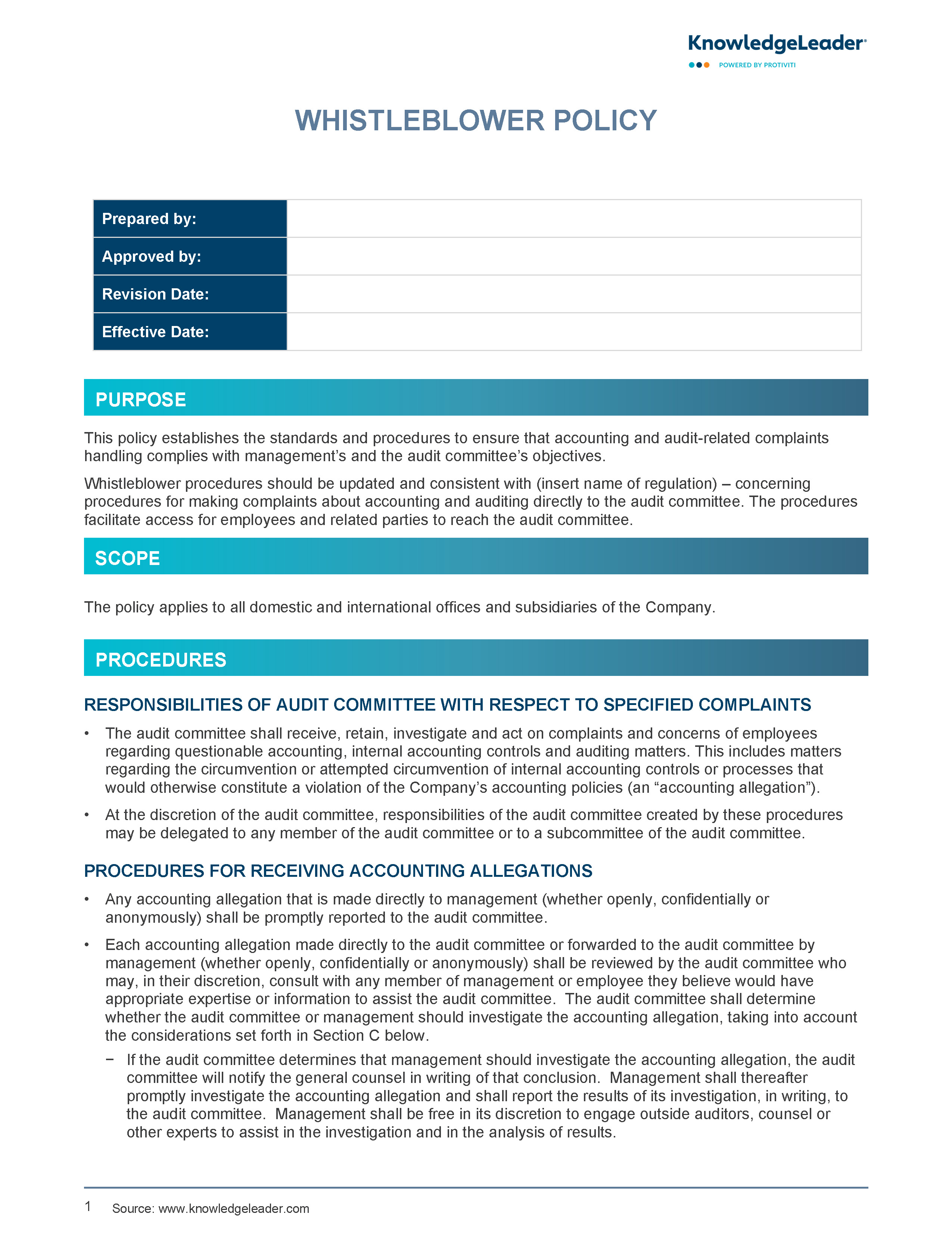 Utilize this policy to establish procedures and standards for handling your company’s accounting and audit-related complaints. This policy outlines the audit committee's responsibilities in receiving, retaining, investigating and acting on complaints concerning questionable accounting practices, internal controls and auditing matters. It ensures that all allegations are dealt with seriously and systematically, providing clear channels through which employees and related parties can report concerns either openly, confidentially or anonymously.